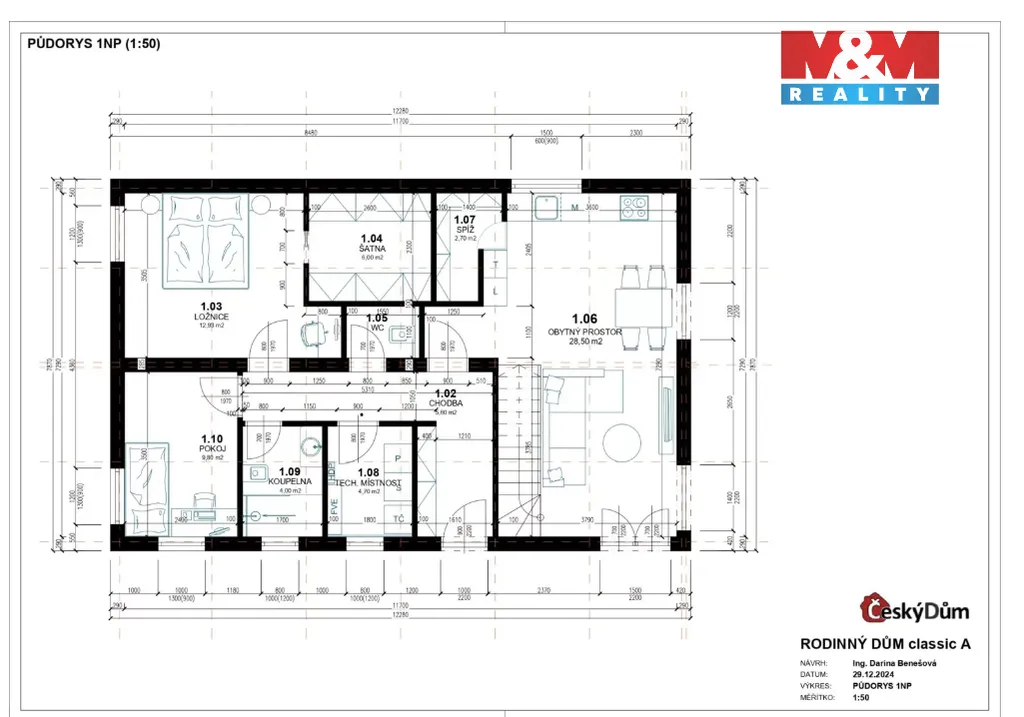 Dům je navržen jako moderní jednopodlažní stavba, která splní požadavky menší rodiny i páru. A co je nejlepší – interiér si každý klient vybírá podle svého vkusu. Podlahy, dveře, koupelna – vše bude přesně podle Vašich představ.