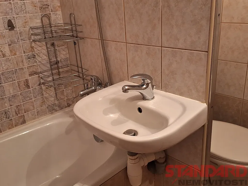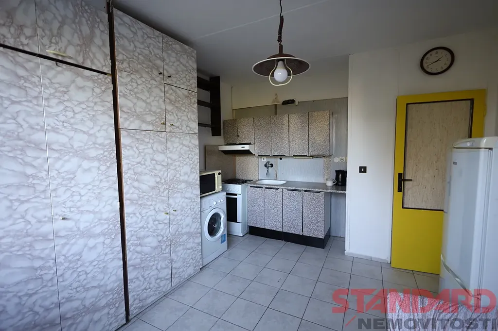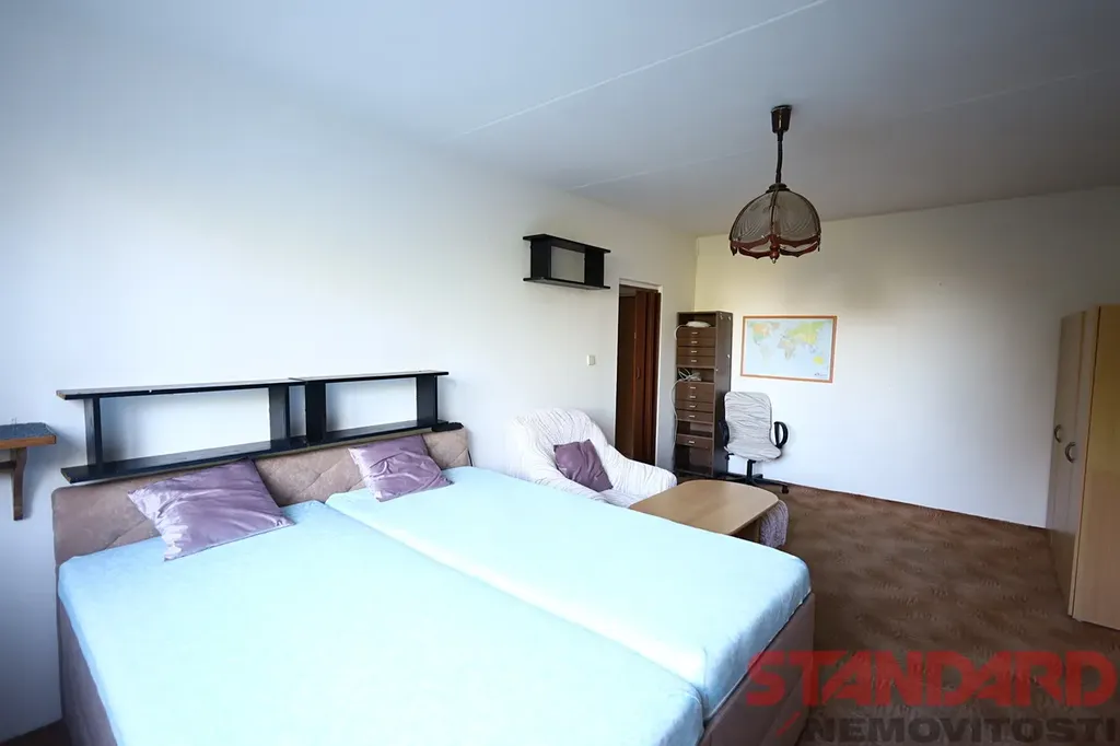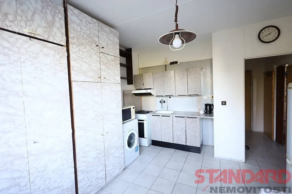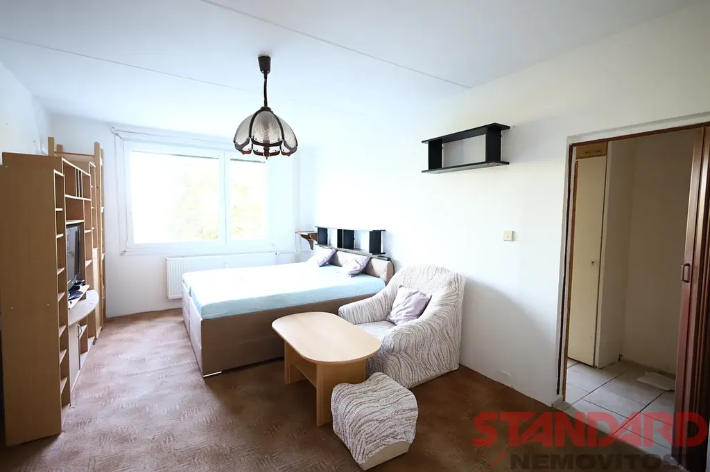 Do bytu vcházíme přes malou předsíň se šatní skříní, ze které ve vstup do koupelny s toaletu, umyvadlem a vanou a dále do kuchyně se starší kuchyňskou linkou, lednicí s mrazákem, plynovým sporákem s troubou a digestoří a mikrovlnou troubou. Je zde také pračka, úložné skříně, gauč a křeslo. Z kuchyně je vstup do druhého pokoje, který slouží jakou obývací pokoj/ložnice, která je zařízena stěnou s televizí, manželskou postelí, křeslem a dalším nábytkem - viz fotodokumentace.