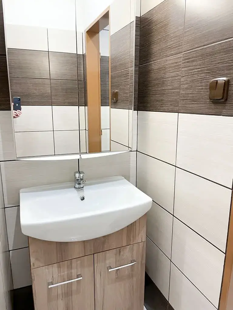 Byt je navržen s důrazem na efektivní využití prostoru a komfort každodenního života. Hlavní obytná část plynule navazuje na moderní kuchyňský kout vybavený spotřebiči včetně kávovaru a dostatečným úložným prostorem. Koupelna disponuje sprchovým koutem, toaletou a pračkou. Velkým benefitem je prostorné vyvýšené patro sloužící jako útulná ložnice, která zároveň uvolňuje prostor v obývací části. Interiér je zařízen tak, aby nájemník mohl bydlet okamžitě a bez starostí.