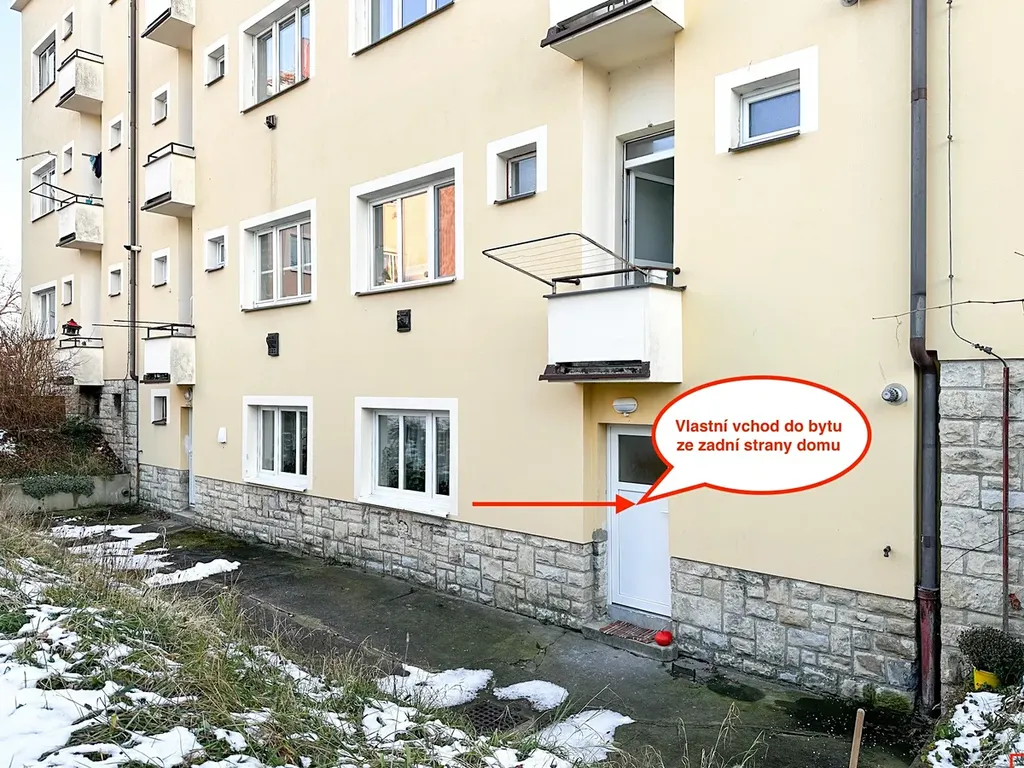 Vstup je řešen vlastním vchodem ze zadní části domu, což zaručuje naprosté soukromí. Byt je vytvořen ze suterénních prostor domu, má ale plnohodnotná okna a není ze strany vchodu a oken nijak zapuštěn do terénu.