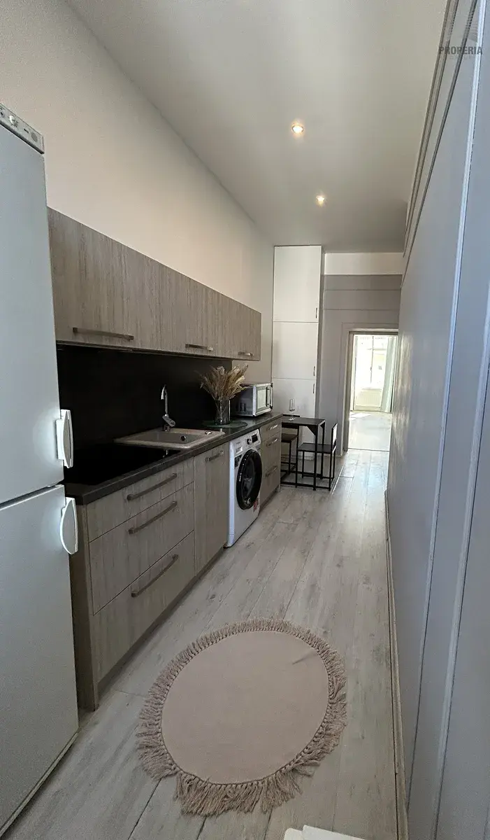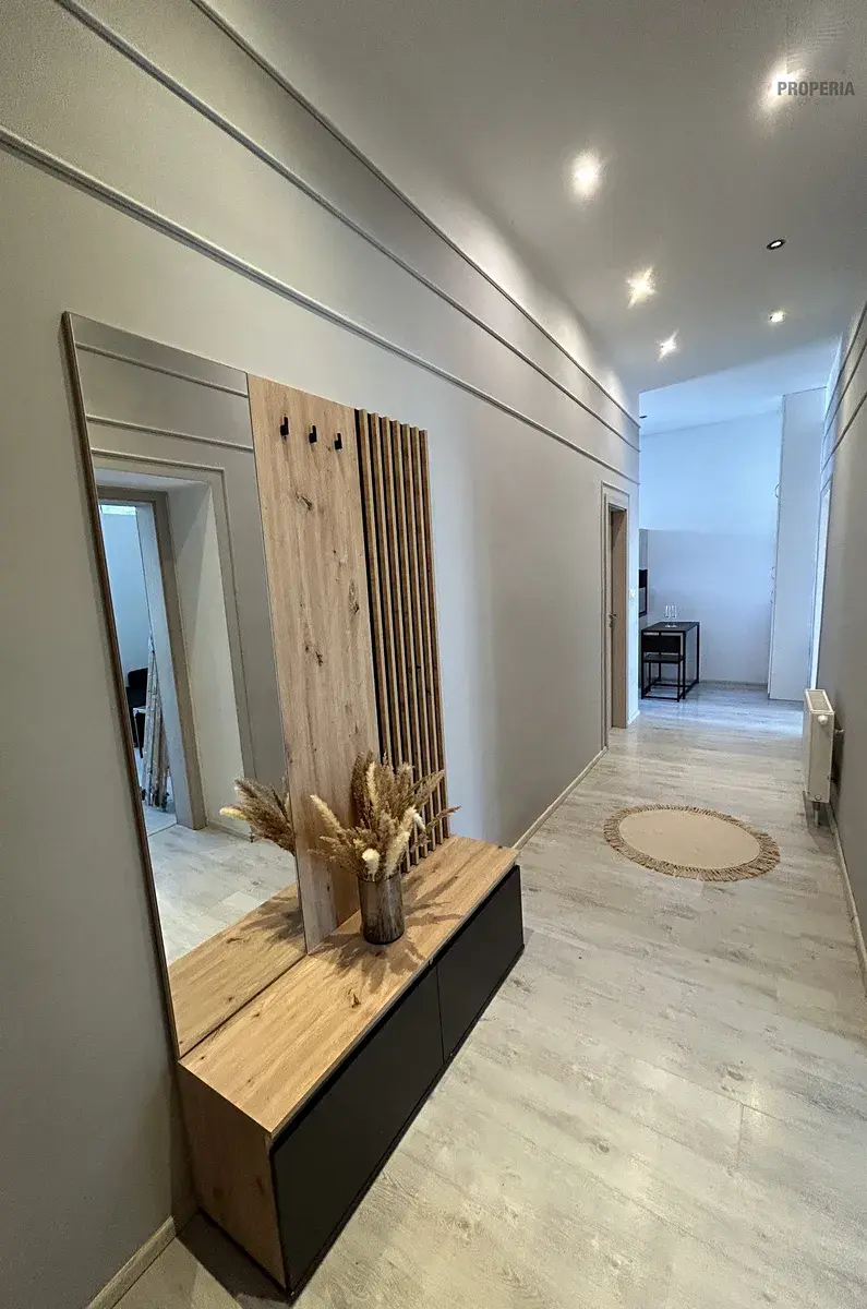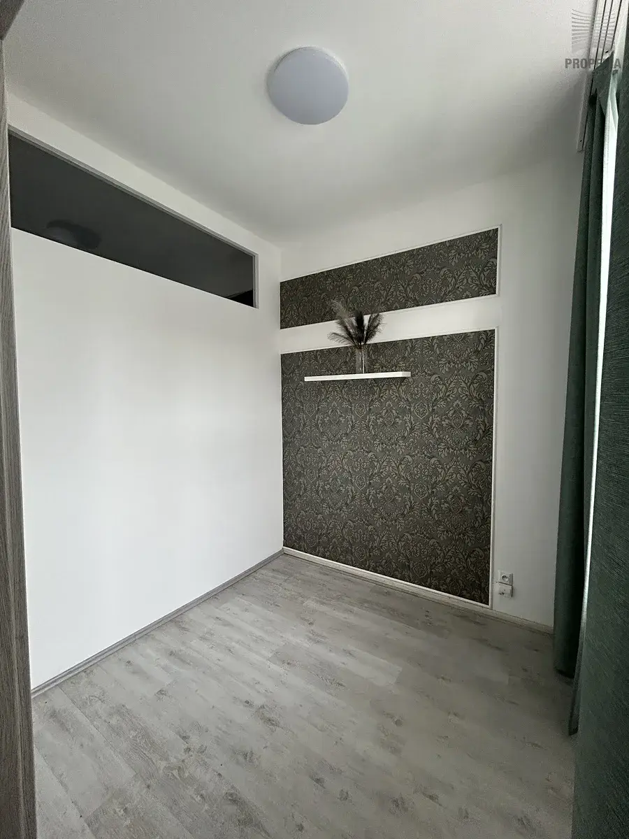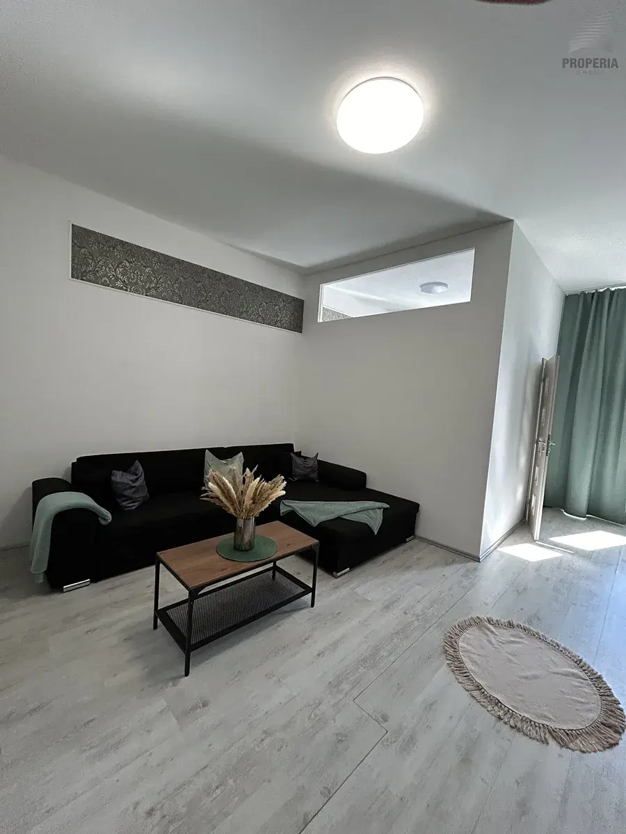Součástí moderní kuchyňské linky je varná deska, lednice, mikrovlnná trouba a pračka, nechybí ani jídelní stůl se židlemi. Prostor je světlý díky velkému oknu s výhledem do klidné části ulice. Koupelna je zrekonstruovaná a nabízí rohovou vanu, závěsné WC, velké umyvadlo a otopný žebřík. Obývací pokoj je vybaven prostornou rohovou sedačkou, moderní nábytkovou stěnou a dalšími úložnými prvky, místnost působí elegantně a vzdušně. Další dva pokoje lze využít jako ložnici, dětský pokoj nebo pracovnu.