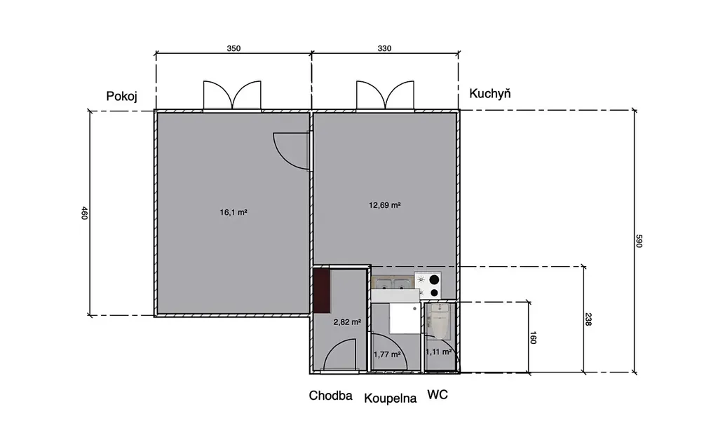 V kuchyni je kuchyňská linka s elektrickým sporákem. V koupelně je sprchový kout, pračka a WC je odděleno příčkou. Na chodbě je šatní skříň s velkým úložným prostorem. V pokoji bude nová podlaha. Byt bude vymalován.