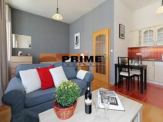 Zařízený byt k pronájmu, 1+kk, 35m2, situovaný ve 4. patře zrekonstruovaného bytového domu s výtahem. Budova se nachází v klidné rezidenční lokalitě na Vinohradech, v blízkosti zastávky tramvaje, 3 minuty chůze ke stanici metra Náměstí Míru, 7 minut chůze do Riegrových sadů či Havlíčkových sadů, blízko obchodů, kaváren a restaurací. Dispozice bytu: vstupní předsíň, místnost s obývací částí, částí na spaní, jídelní částí a otevřenou plně vybavenou kuchyní se spotřebiči (sklokeramická varná deska, trouba, lednice s mrazákem, myčka, mikrovlnná trouba plus rychlovarná konvice, toaster a nádobí) a koupelna (se sprchovým koutem, umyvadlem, toaletou a pračkou).
