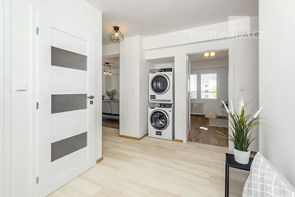Hned za vstupem vás přivítá velkorysá hala. Ne stísněný tunel, ale prostor, kde se dá žít – převléct děti, složit tašky, postavit botník i lavici. Praktická nika na pračku a sušičku drží technické věci mimo obytnou část.