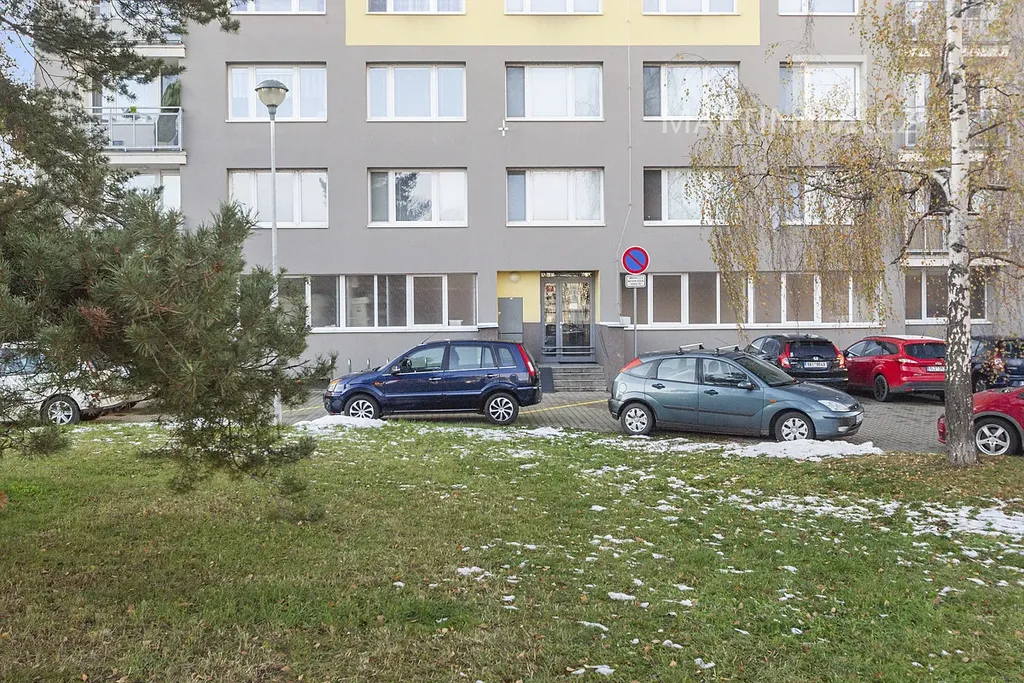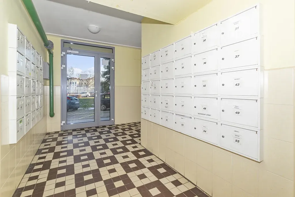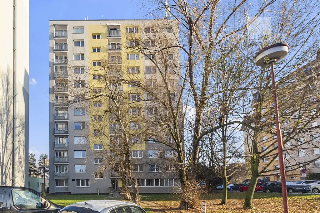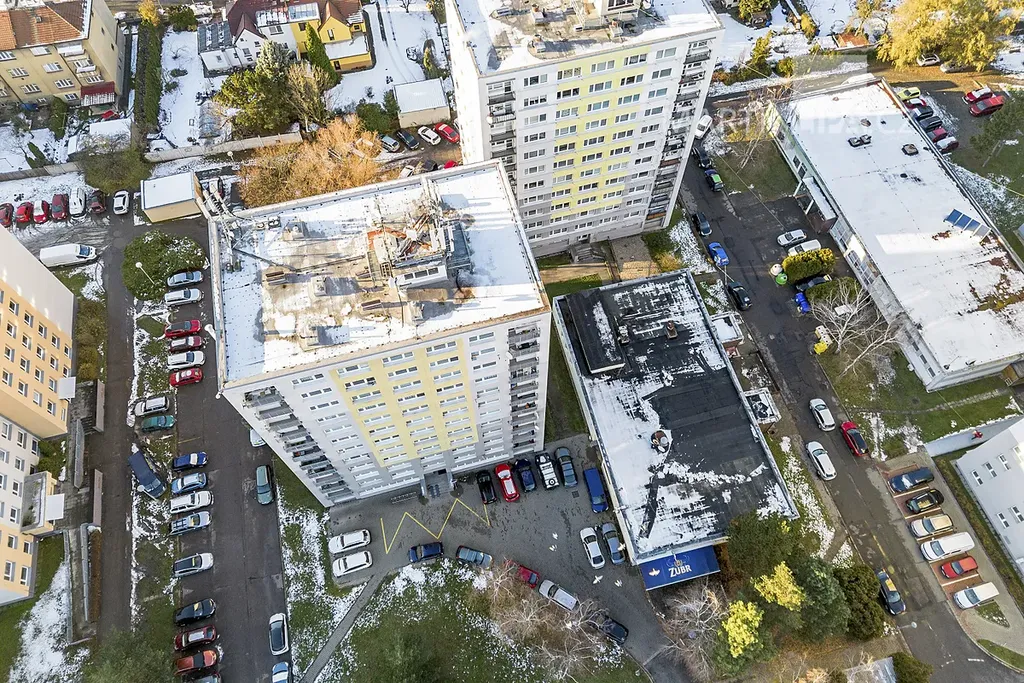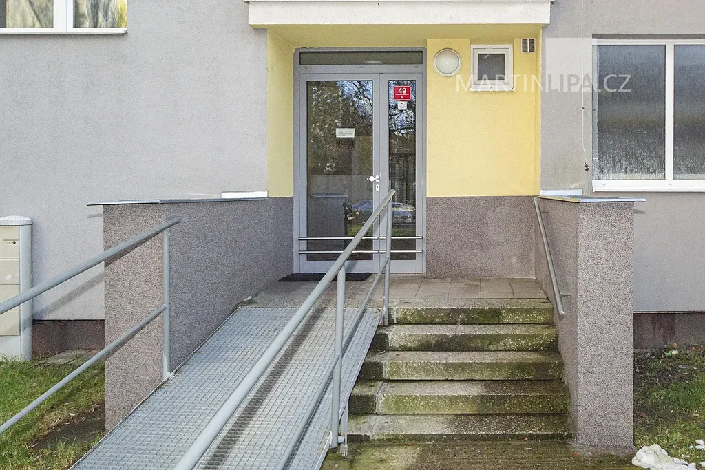 Dům je zateplený, má dva výtahy, dva vchody, zadní bez bariér díky rampě. Udržovaný vstup, kolem domu zeleň, parkování v okolí relativně snadné.