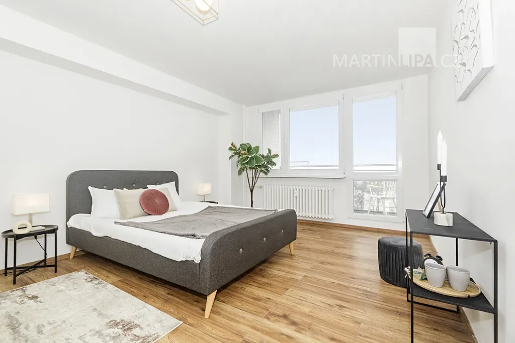 A teď do ložnice, kde rána začínají a večery končí. Na více než 22 metrech se sem vejde velká postel, skříň i pracovní stůl a pořád tu zůstane místo, aby místnost dýchala. Velká okna, vstup na lodžii. Místo, kde si člověk neukopne palec o postel a klidně si zacvičí jógu.