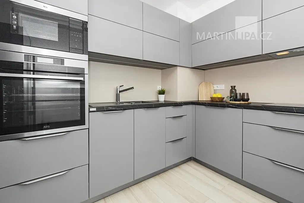 Přesuňme se rovnou do kuchyně. Ne malá, ne obří – tak akorát. Čisté linie, úložné prostory, vestavné spotřebiče AEG, indukce, mikrovlnka, trouba, a k tomu americká lednice s výrobníkem ledu. Velké okno poskytne světlo pro všechna vaše kulinářská kouzla – a když kouzlo selže, snadno vyvětráte.
