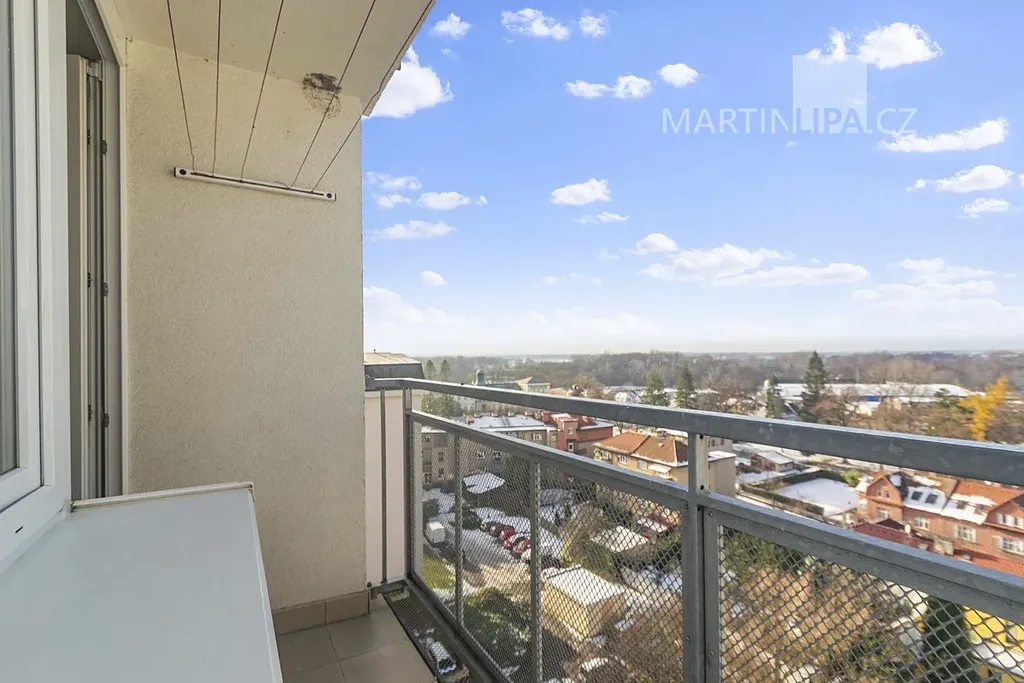 Byt má dvě lodžie – západní z obýváku, východní z ložnice. Ranní káva nad Poděbrady, večerní sklenka při západu slunce. Z 11. patra je vidět pěkně daleko.