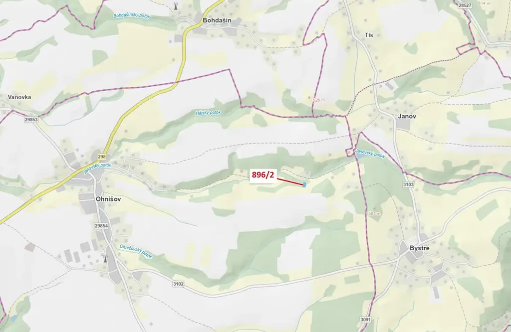 Lesní pozemek o výměře 978 m2, parcelní číslo 896/2, podíl 1/1, katastrální území Ohnišov, obec Ohnišov, obec s rozšířenou působností Dobruška, okres Rychnov nad Kněžnou, Královéhradecký kraj. Po těžbě.