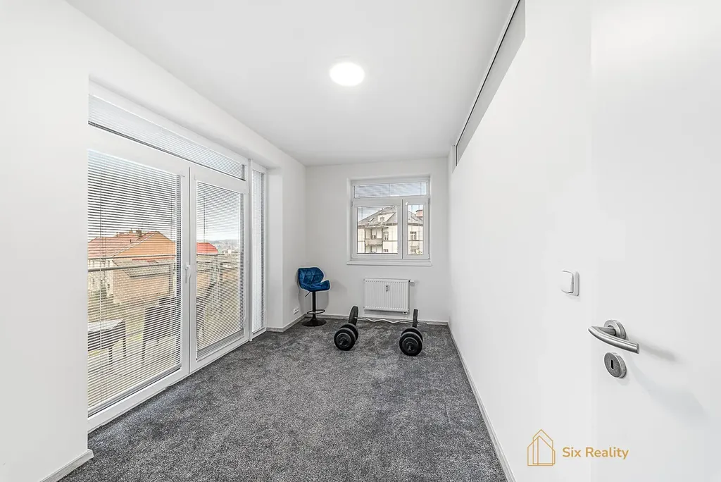 Dům má pouze čtyři podlaží a čtrnáct bytových jednotek, takže prostředí je klidné a sousedské. Vlastní parkovací stání je samozřejmou součástí pronájmu.