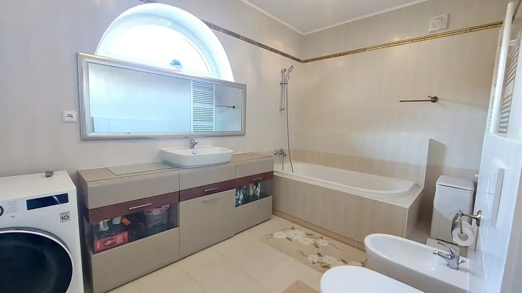 V 1. patře je 2 x koupelna 9m² a 6m², 5x pokoj 18m², 11m², 15m², 12m², 9m² (1x s šatnou), chodba 15m² a vstup na půdu.