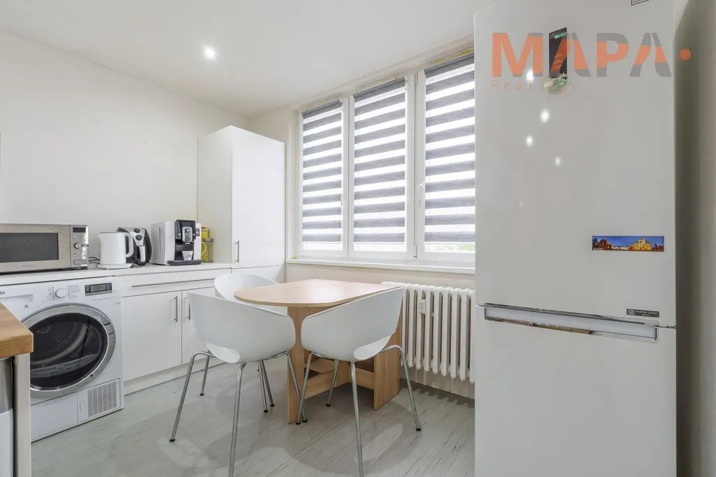 Kuchyně: linka, sporák, pračka, lednice, jídelní stůl + 3 židle