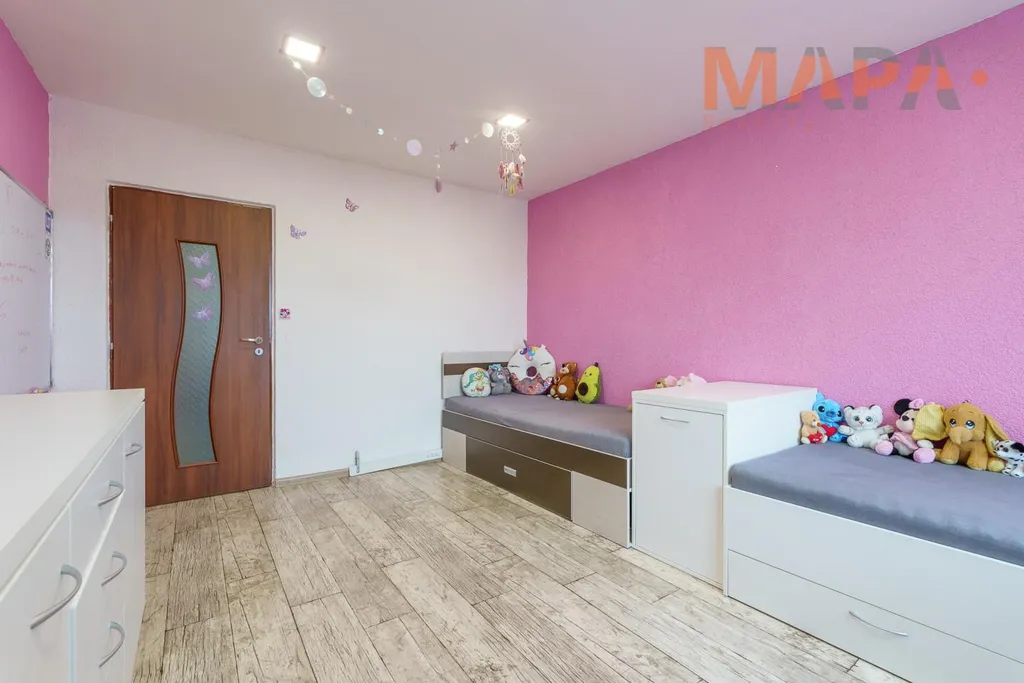 Dětský pokoj: psací stůl, židle, komoda, 2× postel
