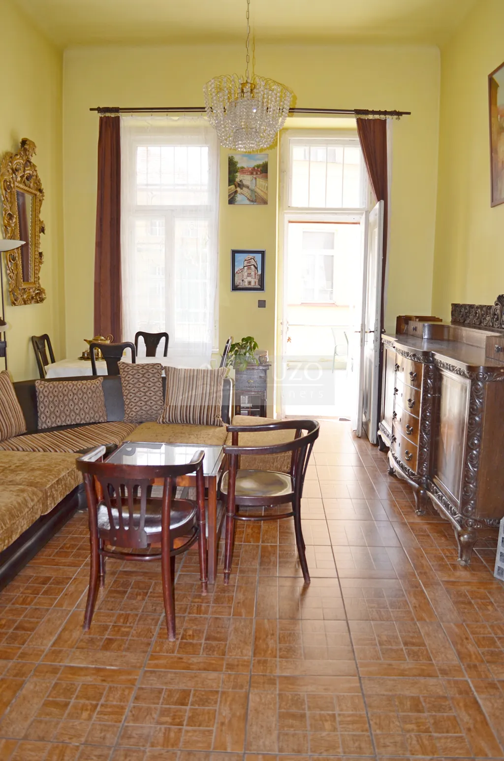 Nabízený byt se nachází ve druhém podlaží cihlového domu, který je ve velmi dobrém stavu a má celkem pět podlaží. Vysoké stropy dosahující výšky 4 metry dodávají interiéru vzdušnost a prostor, a umožňují tak výrazně využít potenciál tohoto bytu. Dispozice zahrnuje neprůchozí pokoje, které zajišťují soukromí pro všechny obyvatele.