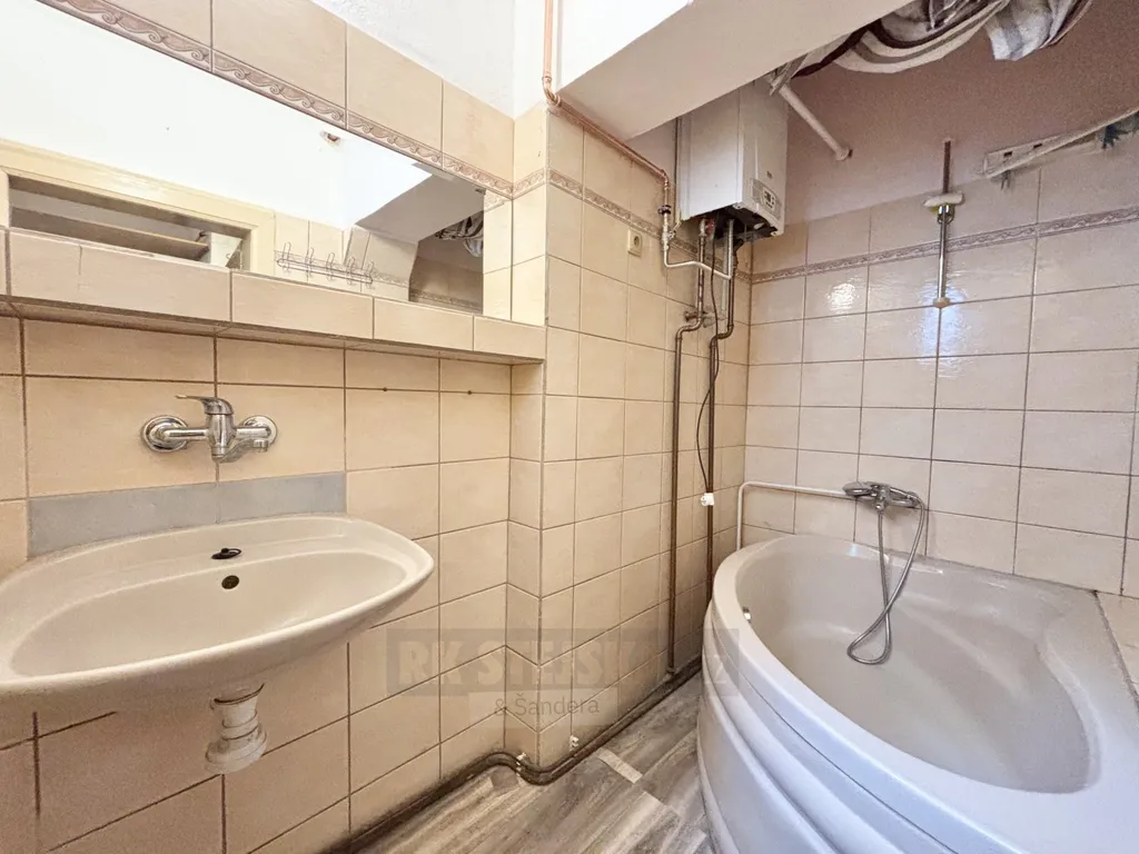 Do bytu vstoupíte stylovými dvojkřídlými dveřmi, které vás zavedou do praktické předsíně s věšákem a dostatkem místa pro botník. Z chodby je přístupná koupelna vybavená prostornou vanou a umyvadlem se zrcadlem, toaleta je pak prakticky umístěna samostatně. Následuje velmi prostorná kuchyň, kde kromě kuchyňského koutu oceníte také dostatek místa pro jídelnu a velké úložné skříně. Kuchyňská linka je vybavena spotřebiči – novým elektrickým sporákem s troubou, myčkou a digestoří – a je zde připraven i prostor pro pračku. Na kuchyň navazuje velkorysý obývací pokoj, který díky své velikosti umožní vytvořit komfortní obytný prostor. Za obývacím pokojem se nachází samostatná, oddělená ložnice. Byt je vytápěn plynovým kotlem a radiátory.