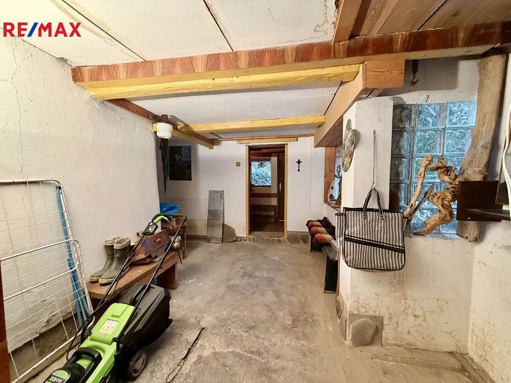 V přízemí domu je obývací pokoj s krbovými kamny, kuchyň, chodba, wc a sprchový kout (chybí klasická koupelna). V tomto podlaží je dále prostorná garáž, místnost s vícero využitím a menší sauna.