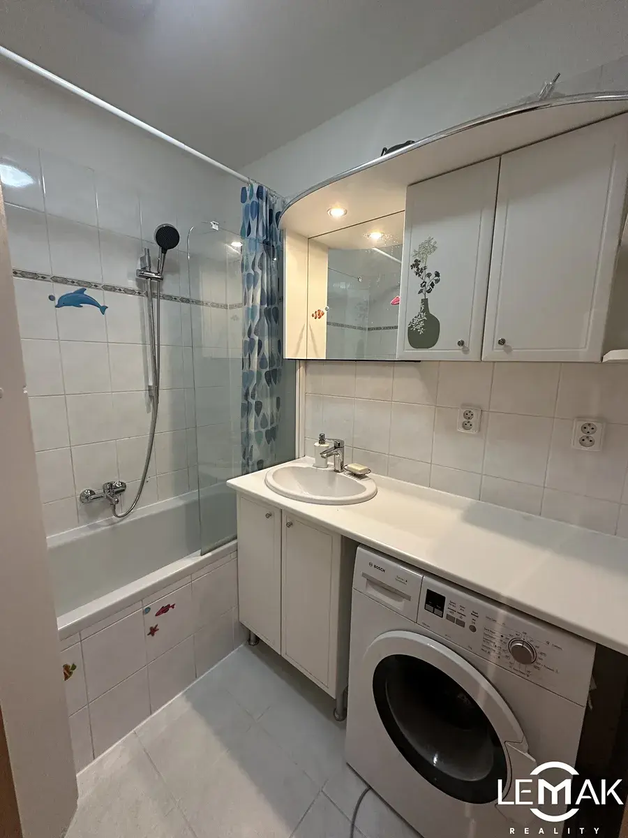 Po vstupu do bytu se ocitneme v prostorné chodbě, která propojuje téměř všechny místnosti. V chodbě se nachází velká vestavěná skříň a botník, díky nimž je interiér přehledný a prakticky řešený. Dominantou bytu je světlý obývací pokoj propojený s moderní kuchyní. Kuchyňská linka disponuje vestavěnými spotřebiči včetně myčky a nové lednice a je doplněna o praktický bar. Součástí obývací části je sedací souprava a TV stolek.