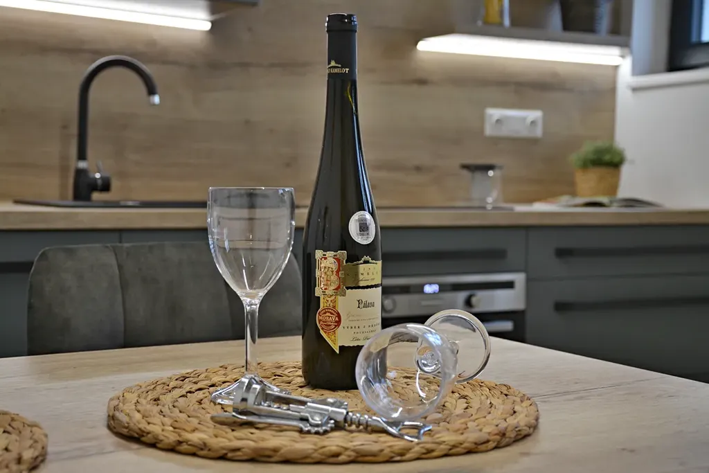 Součástí vybavení je kuchyňská linka na míru se spotřebiči, jídelní stůl se židlemi a v obývací části sedací souprava s konferenčním stolkem. V ložní části pak vysoká postel s matracemi.