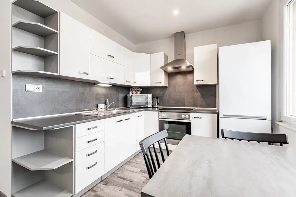 V kuchyni je kuchyńská linka včetně spotřebičů.