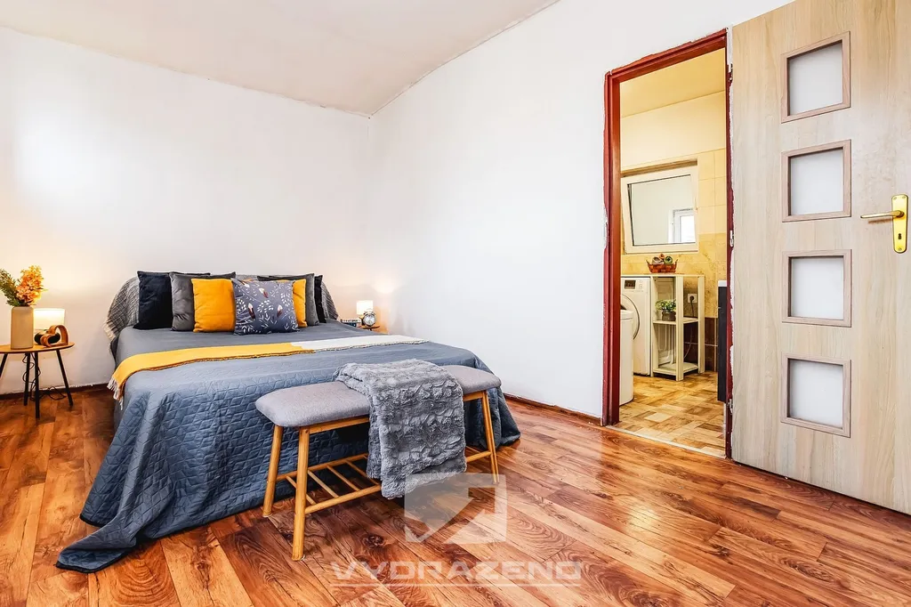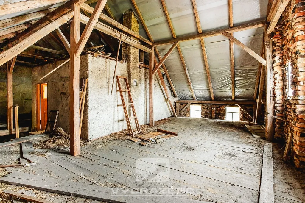V přízemí je obývací pokoj s kuchyňským koutem, tři pokoje, chodba, koupelna s vanou a WC. Podkrovní prostor s možností rozšíření. Kolna a velká stodola.