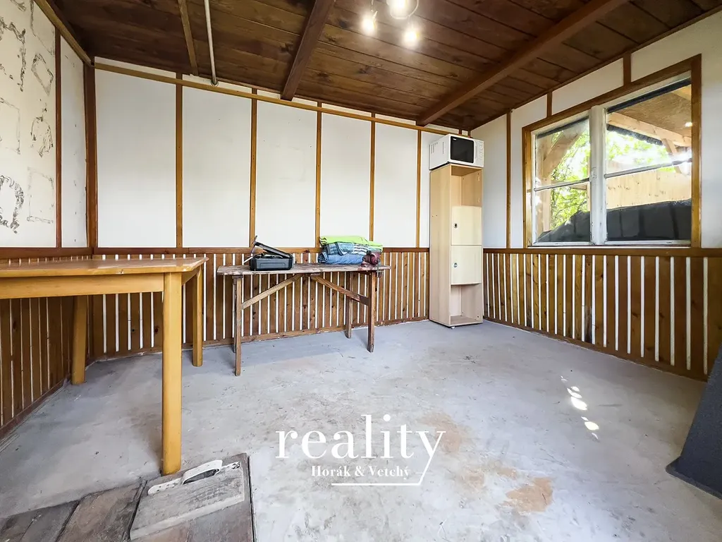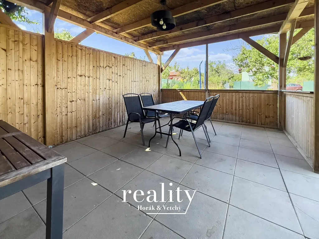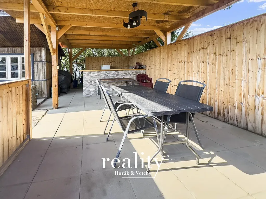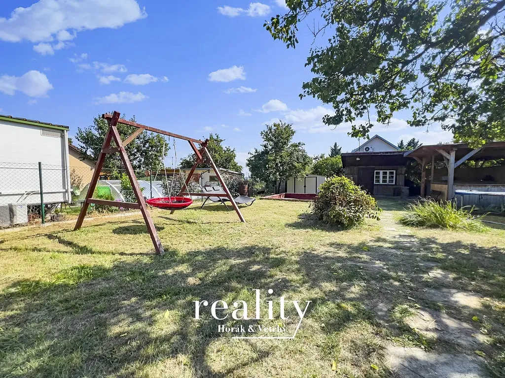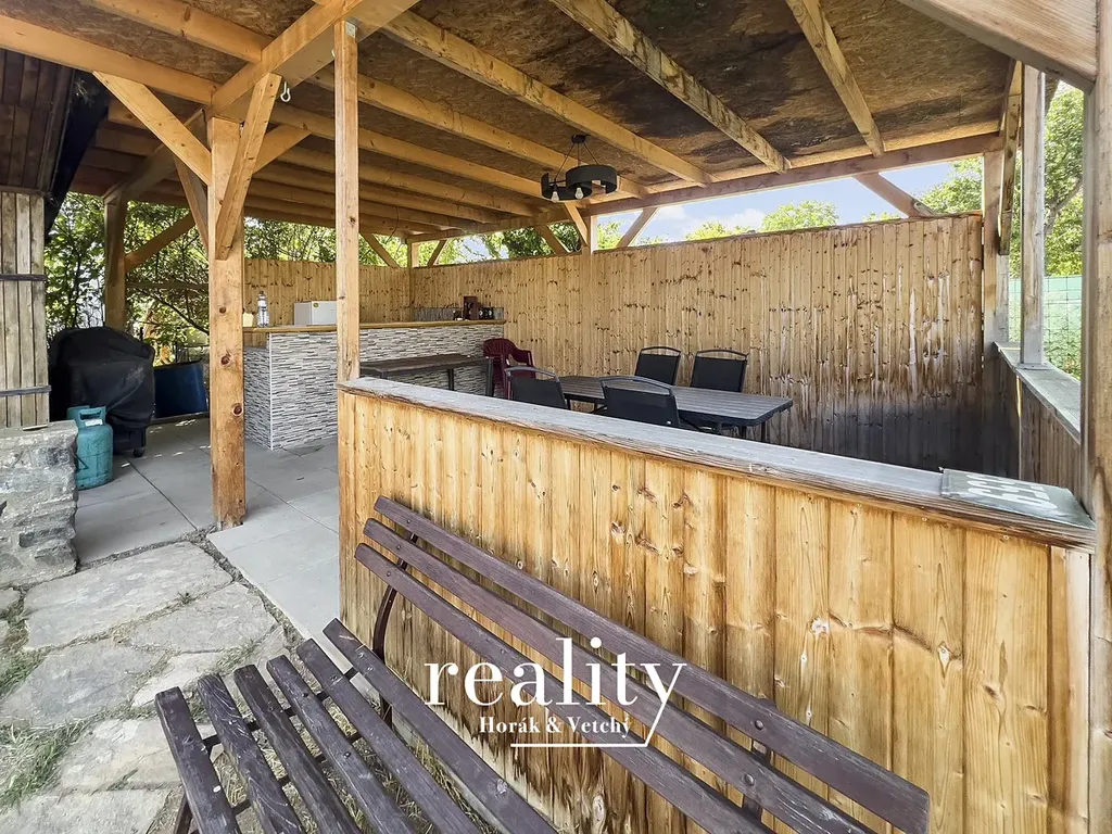 Součástí zahrady je částečně podsklepená dřevěná chatka o zastavěné ploše 15 m², dále zde najdete pergolu s barem a posezením, ohniště s krbem pro letní grilování, dětskou houpačku, trampolínu pro radost nejmenších, suché WC a plechový zahradní domek pro uskladnění nářadí.