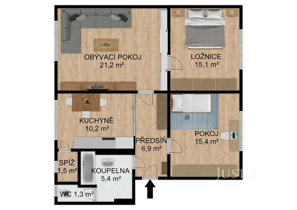 Byt má prakticky řešenou dispozici. Ze vstupní chodby je po levé straně vstup do koupelny vybavené vanou a umístěným plynovým kotlem; koupelna je průchozí na samostatné WC. Z chodby dále vstupujete do kuchyně situované do dvora, odkud je vstup do spíže a dětského pokoje. Naproti vstupu do bytu se nachází obývací pokoj, který je průchozí do ložnice a zároveň z něj vede vstup na balkon orientovaný do vnitrobloku.