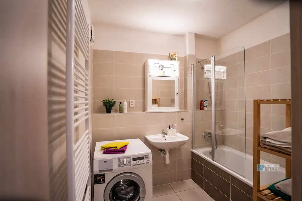 • má bytové jádro s vanou a oddělenou toaletou s umyvadlem. Je v moderním střihu a součástí je nová pračka, myčka