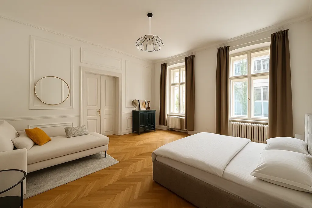Interiér bytu byl kompletně zrekonstruován před cca 1,5 rokem s důrazem na kvalitu a zachování původních architektonických detailů. Velkorysý obývací pokoj nabízí výhled na Národní muzeum. Navazuje na něj plně vybavená kuchyň a dvě prostorné ložnice, z nichž jedna disponuje samostatným vstupem z chodby. K dispozici jsou dvě moderní koupelny. Dále je zde bezpečnostní systém, zachované dvoukřídlé dveře, renovovaná špaletová okna a kvalitní parketové podlahy, které dodávají bytu charakter a eleganci. Vytápění je řešeno elektrokotlem a radiátory s možností snadné úpravy na plynové vytápění (přípojka v bytě). K jednotce náleží sklepní kóje, která se momentálně rekonstruuje, a k dispozici je i společný vnitroblok.