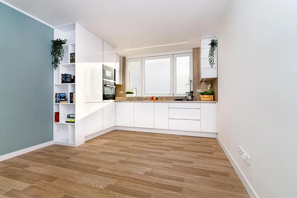 - Plnohodnotná kuchynská linka s vestavěnými spotřebiči, která bude plynule přecházet do obývací stěny