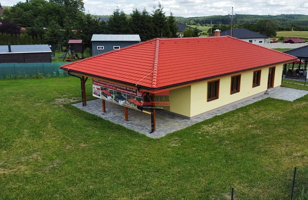 Dům nabízí celkovou plochu 138,08 m². Dispozice je prakticky řešená: prostorné zádveří (8,91 m²), světlý obývací pokoj s kuchyňským koutem (47,98 m²) a přímým vstupem na terasu, tři samostatné pokoje (11,71 m², 11,71 m² a 13,2 m²), praktická chodba (7,97 m²) s druhým vstupem do domu, koupelna se sprchovým koutem (7,31 m²) a samostatná toaleta (2,17 m²). Kvalitní vinylové podlahy podtrhují moderní a příjemnou atmosféru interiéru. Součástí domu je také přístřešek o velikosti 27,09 m² a zahradní domek o výměře 19 m². Celý pozemek o rozloze 1 332 m² je kompletně oplocený a opatřený elektrickou vjezdovou bránou.