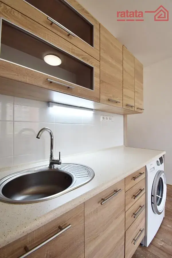 Je zde nová kuchyňská linka, el. deska + trouba, pračka, lednice, vestavěná skříň, vana s umyvadlem a zrcadlem, WC. Na podlahách je položeno lino a dlažba. Byt je volný k nastěhování od 1.1.2026.
