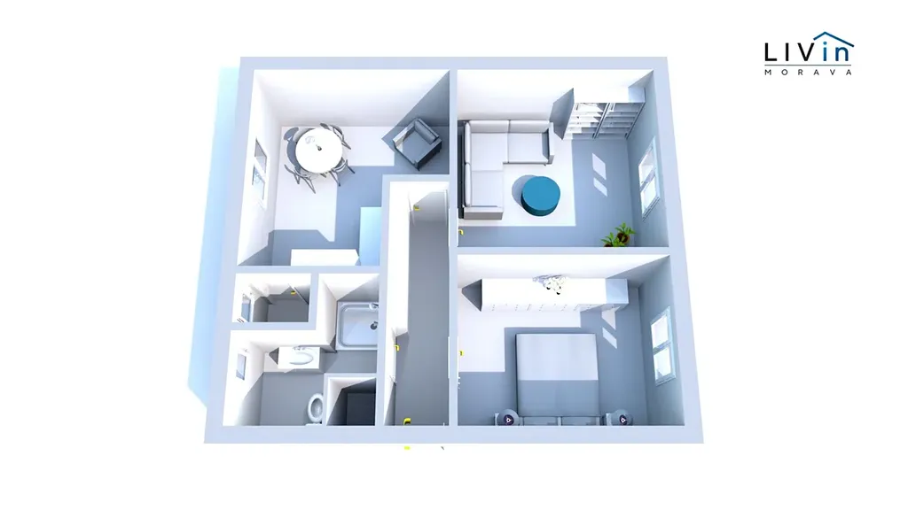Kuchyň zahrnuje kuchyňskou linku, indukční varnou desku, křesílko a TV. Z kuchyně vedou dveře do komory/spižírny, kam je možné umístit lednici. V koupelně je prostorný sprchový kout, umyvadlovo, zrcadlo, pračka, WC i pisoár. Obývací pokoj původně sloužil jako kancelář a je vybaven sedačkou, konferenčníkm stolkem a velkým pracovním stolem (tento stůl je možno po dohodě přesunout mimo byt). V ložnici se nachází manželská postel, noční stolky a komoda.