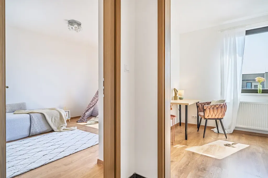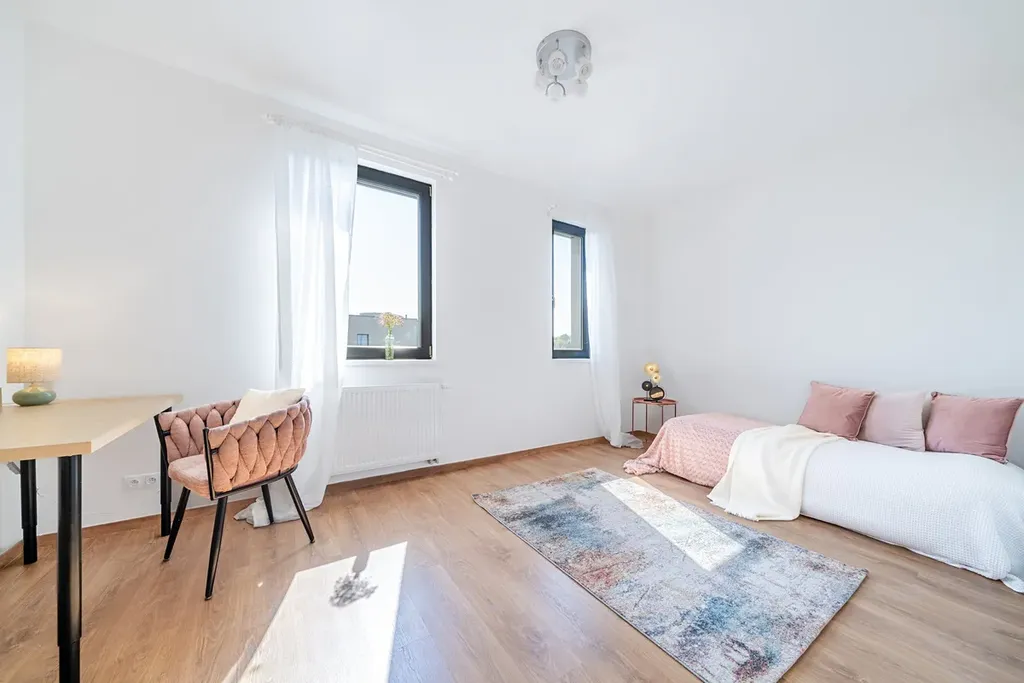 3 neprůchozí ložnice (13–14 m²), velkorysý obývací pokoj s kuchyňským koutem (34 m²), koupelna s vanou a WC, samostatná toaleta, komora s místem pro pračku/sušičku