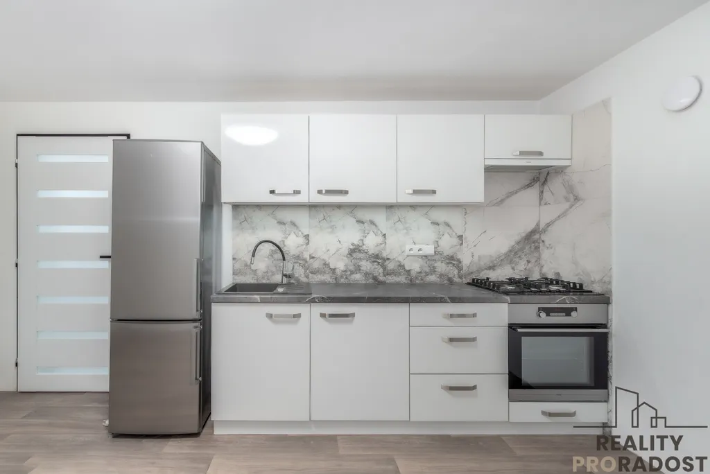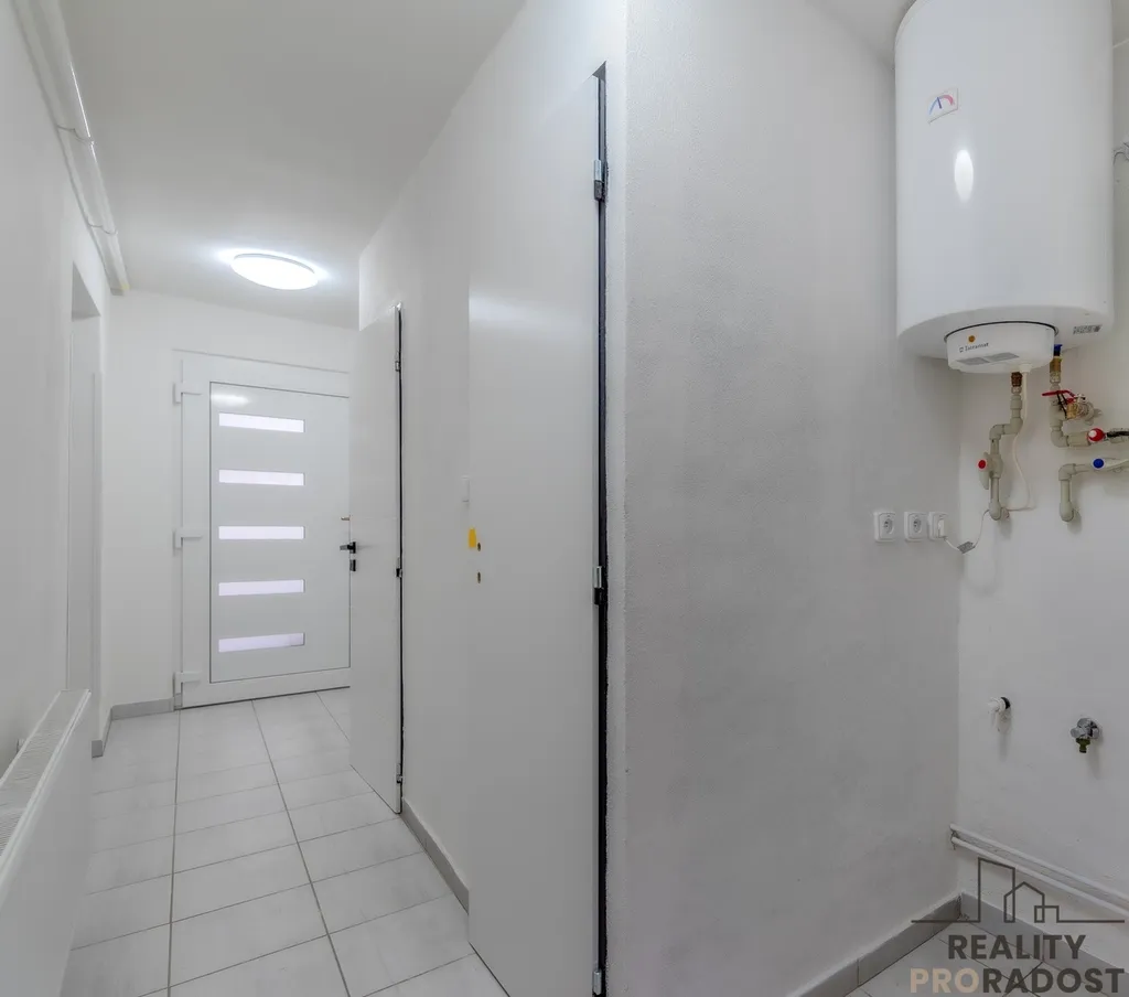 Jedná se o dům s novou šedou fasádou se soklem obloženým kamenem, který domu velmi sluší a plastovými vchodovými dveřmi a okny s trojskly v klidné uličce v Moravském Krumlově – Rakšicích.