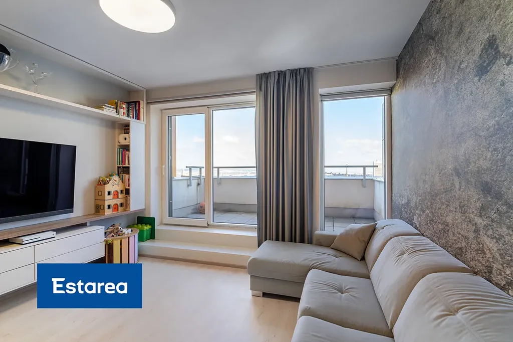 Hlavní prostor bytu - překrásný obývací pokoj spojený s obytnou kuchyní vás uchvátí svou světlostí i výhledem.