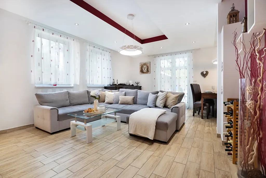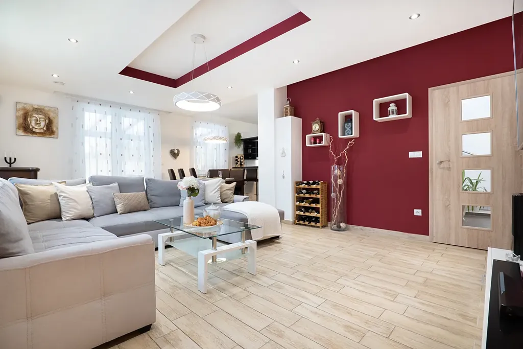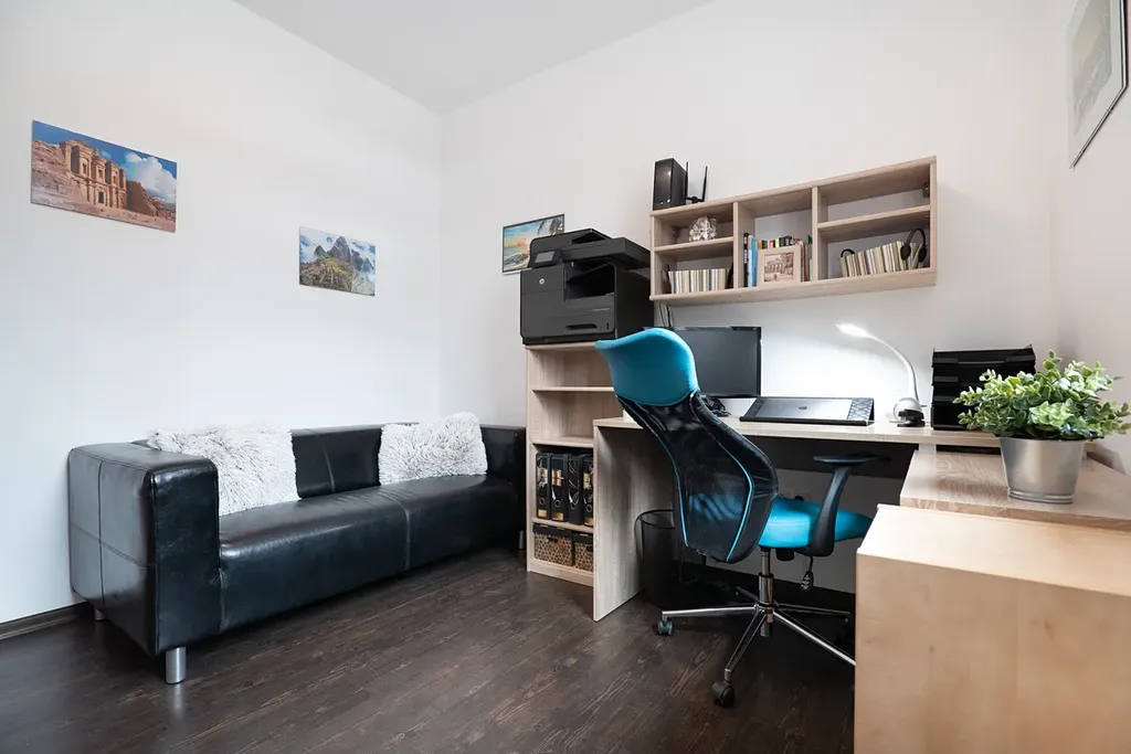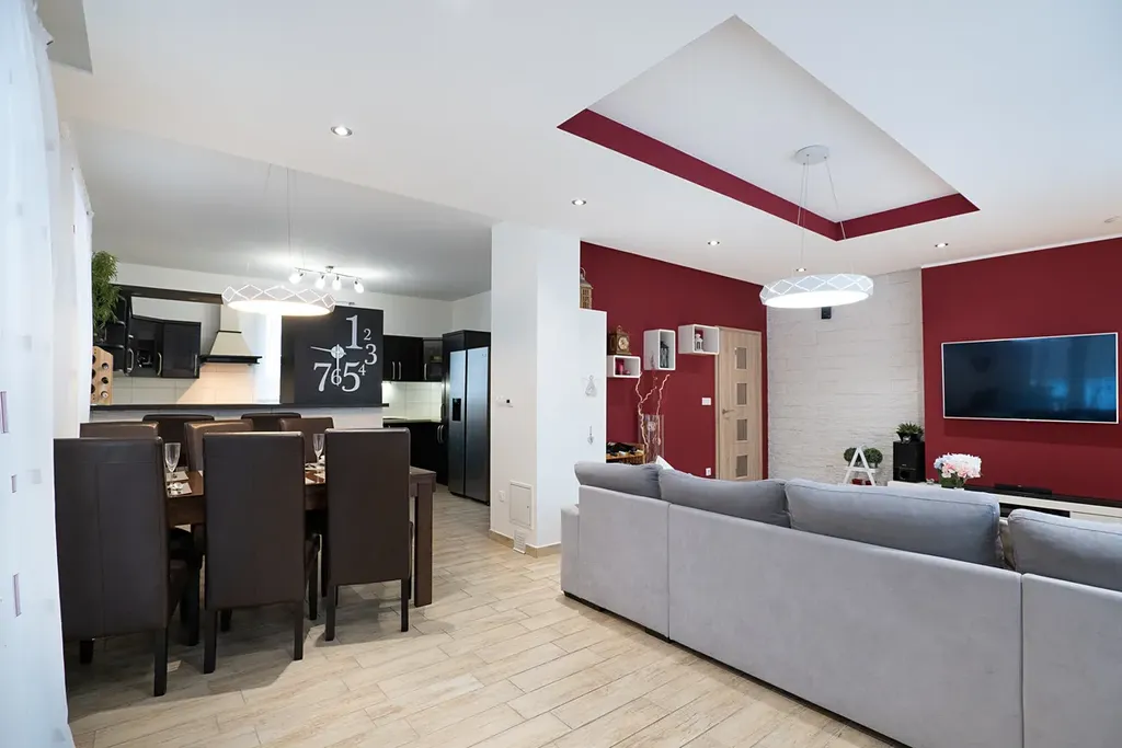 Dominantou interiéru je velkorysý otevřený obývací pokoj s jídelnou a moderní kuchyní s barovým pultem (celkem přes 50 m²). Odtud je přímý vstup na zastřešenou terasu 28 m², ideální pro celoroční posezení. V obýváku je připravena kompletní příprava pro krb. V přízemí dále najdete prostornou vstupní halu s vestavnou skříní, spíž, koupelnu se sprchou a WC, pracovnu a technickou místnost s přístupem do menšího sklípku – perfektní kombinace komfortu a praktického využití prostoru.