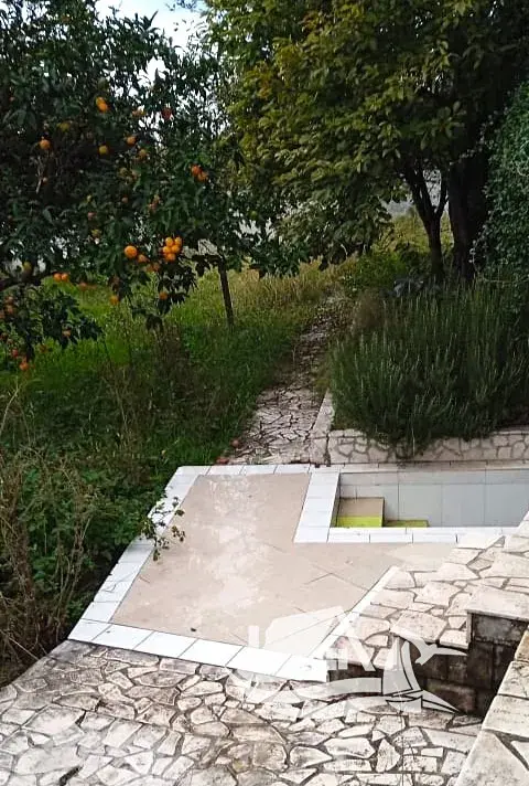 Dům je ve velmi dobrém stavu, suchý a čistý. Má rozlehlý dvůr o velikosti 1000 m², který je členěn do dvou teras a nabízí dostatek prostoru pro vybudování bazénu nebo zahradní úpravy podle vašich představ. Krásný výhled na moře, který není ničím omezen, zaručuje klid a soukromí.