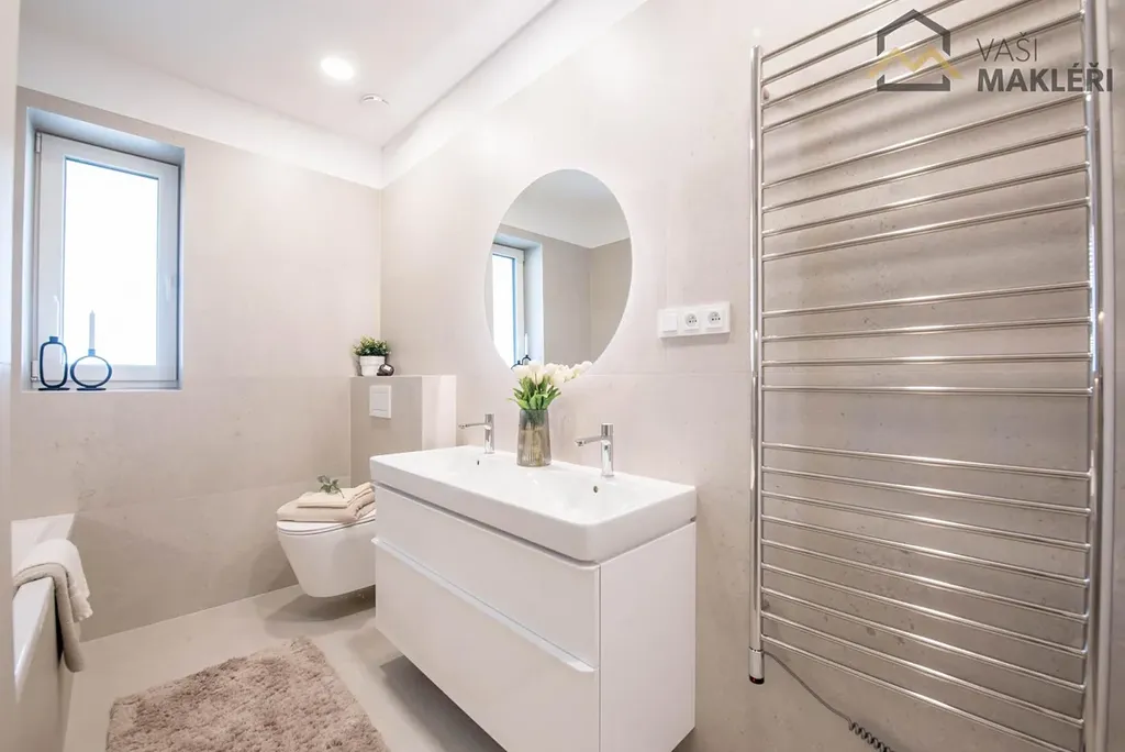 Oblíbenému dispozičnímu řešení 4+kk dominuje prostorný obývací pokoj (44 m2), který zaujme panoramatickým oknem a vstupem na zastřešenou terasu, které je v letních měsících dalším obytným prostorem. Na míru zhotovená kuchyňská linka je plně vybavena vestavěnými spotřebiči, chytře odděluje kuchyňský kout od zbylé části obývacího pokoje a je v ní zakomponována skrytá spížová místnost. Nemovitost dále disponuje třemi ložnicemi s rozdílnými výměrami. Prostorná koupelna je vybavena sprchovým koutem i vanou, dvěma umyvadly a toaletou, je designově i řemeslně čistě provedena a nabízí ambientní osvětlení nik a zrcadla. Propojovací chodba je spíše menších rozměrů, zádveří naopak poskytuje dostatek místa pro úložné prostory (pro skladování sezónních věcí lze využít i pochozí prostor na půdě) a druhá toaleta je samozřejmostí. Součástí domu je i technická místnost s přípravou pro vytvoření prádelny. V rozložení jednotlivých místností se nejlépe zorientujete z půdorysu, který je součástí inzerátu nebo si dům projděte virtuálně, z pohodlí vašeho domova.
