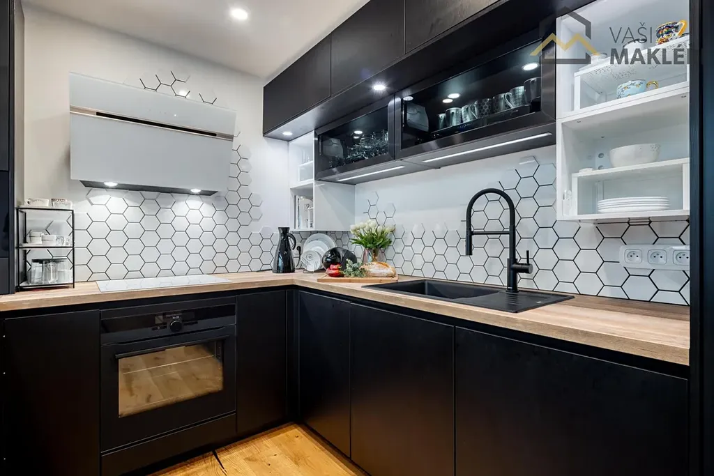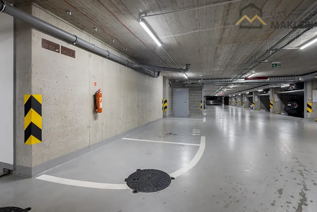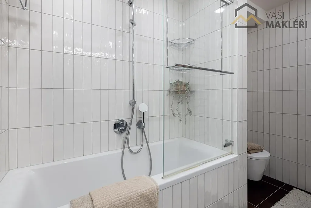 Koupelna je vybavena vanou a kvalitní sanitou, samostatná toaleta disponuje bidetovou sprškou. V celém bytě jsou dřevěné podlahy, kvalitní dlažba, elektricky ovládané předokenní žaluzie a centrální vytápění. Samozřejmostí je pračka se sušičkou, myčka, indukční varná deska, vestavěné skříně i dostatek úložných prostor. K bytu náleží sklep, kryté garážové stání i vlastní venkovní parkovací místo přímo před domem. V domě je k dispozici kočárkárna, místnost na mytí kol a psů, a především nonstop recepce s ostrahou, která zajišťuje pohodlí i bezpečí.