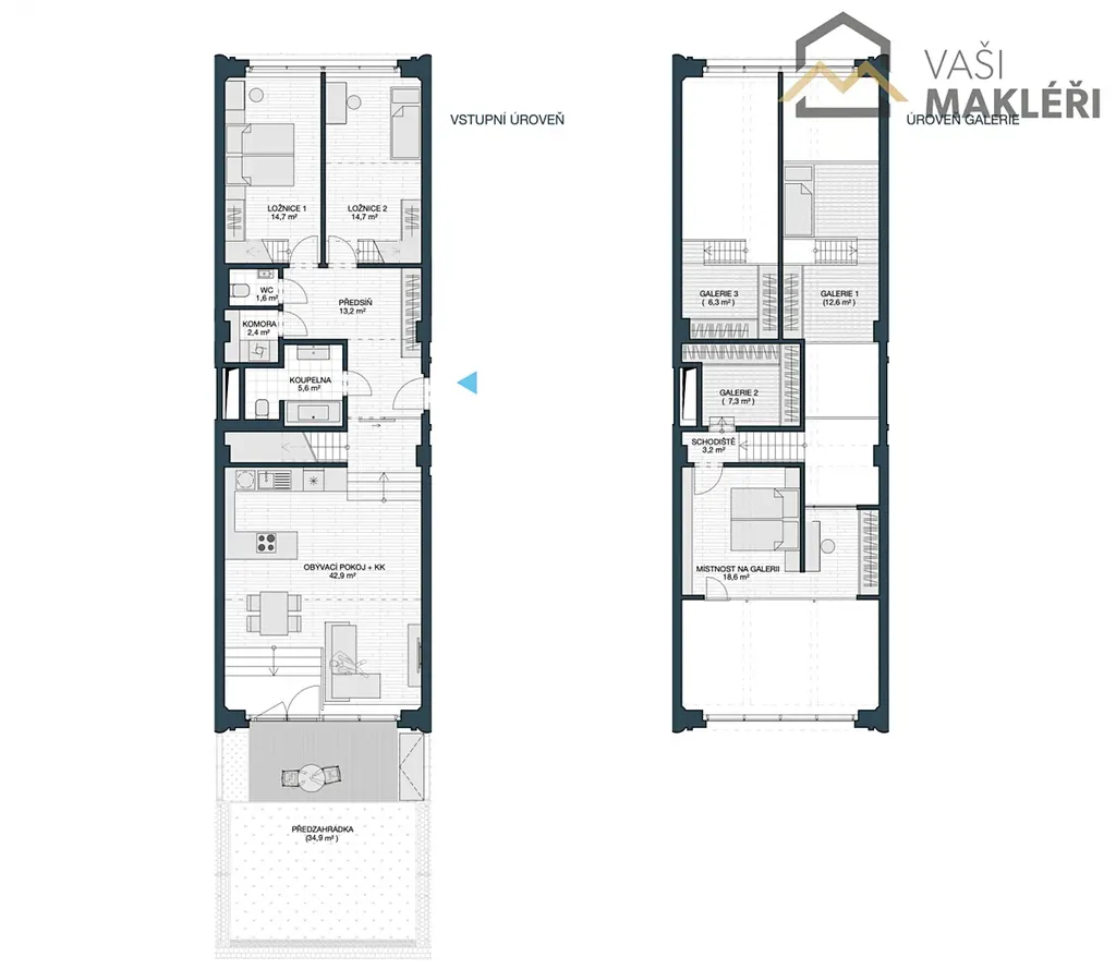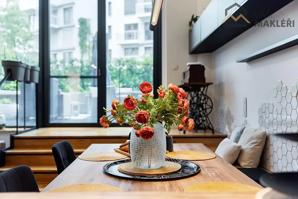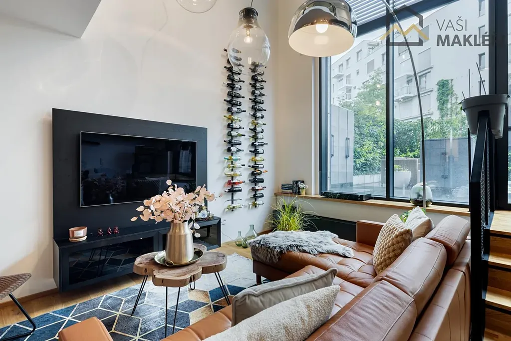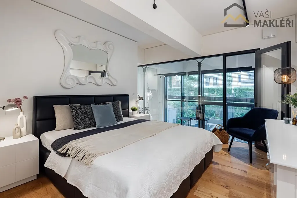 Dominantou bytu je vzdušný obývací prostor s vysokými stropy, velkoformátovými okny a plně vybavenou kuchyní na míru, odkud se vychází na útulnou předzahrádku orientovanou do zeleně. Galerii nad obývacím pokojem lze využít jako pracovnu nebo klidovou zónu, zároveň navazuje na ložnici se soukromou šatnou, umístěnou v elegantně zasklené části bytu. Dvě další ložnice jsou prakticky odděleny, každá s vlastní galerií, a nabízejí flexibilní využití podle individuálních potřeb.