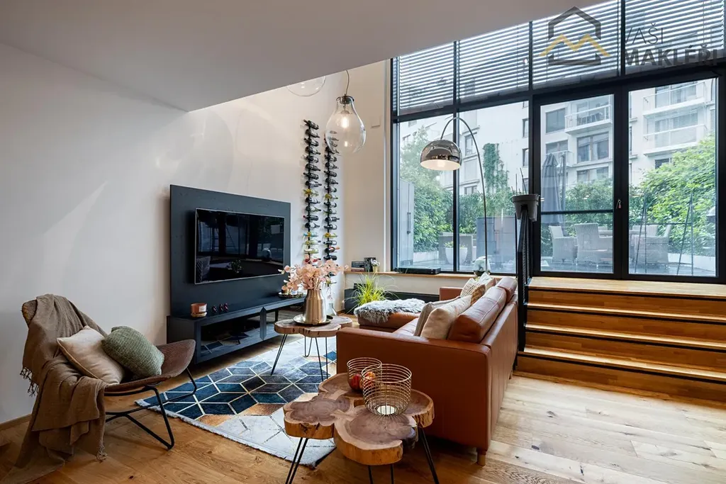 Nabízíme k prodeji výjimečný loftový byt 4+kk o celkové ploše 151 m2 s vlastní předzahrádkou a nádhernými výhledy na Prahu, situovaný v oblíbeném rezidenčním komplexu PARVI Cibulka, který vznikl přestavbou původní industriální haly Meopta. Prostor si zachoval charakter otevřeného loftového bydlení, přičemž každý detail zde byl promyšlen s důrazem na design, kvalitu materiálů a funkčnost.