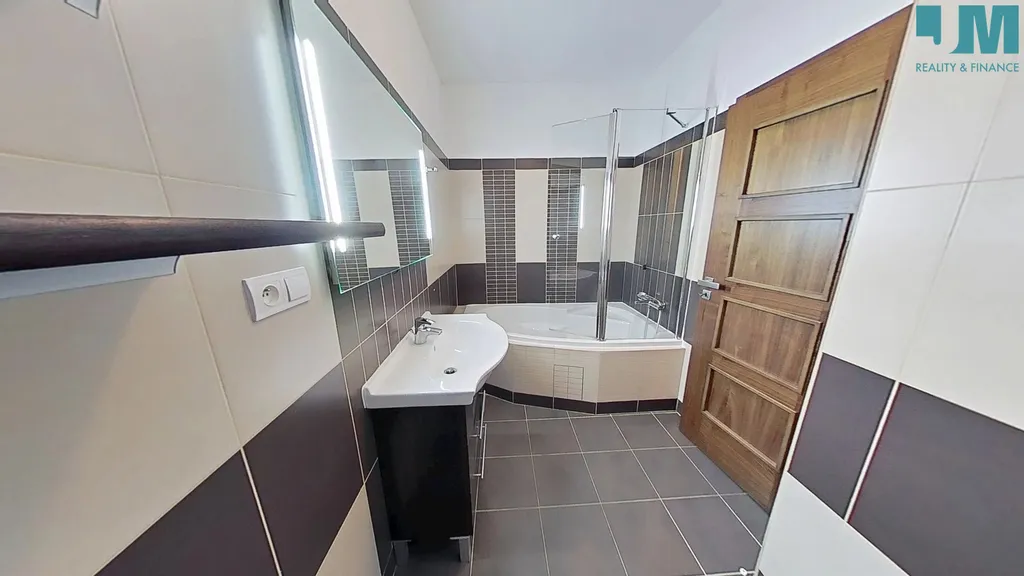 Koupelna je vybavena vanou, umyvadlem se skříňkou a osvětleným zrcadlem, toaleta je samostatně.