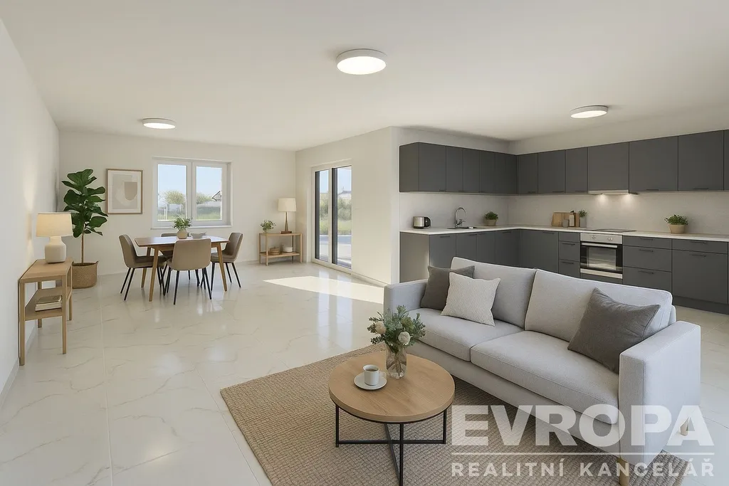 • prostorný obývací pokoj s velkým prostorem pro jídelní a obývací část, s přípravou na kuchyň a vstupem na zahradu