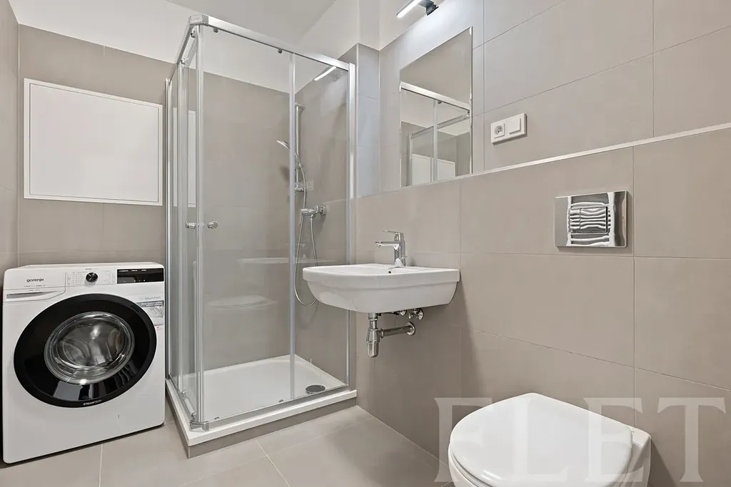 Kuchyně s obývací částí je díky velkému francouzskému oknu krásně prosvětlená, což prostoru dodává vzdušnost a příjemnou atmosféru po celý den. Moderní kuchyňská linka nabízí dostatek úložných prostor a poskytuje komfort pro každodenní vaření. V prostorné koupelně najdete sprchový kout, toaletu a pračku.