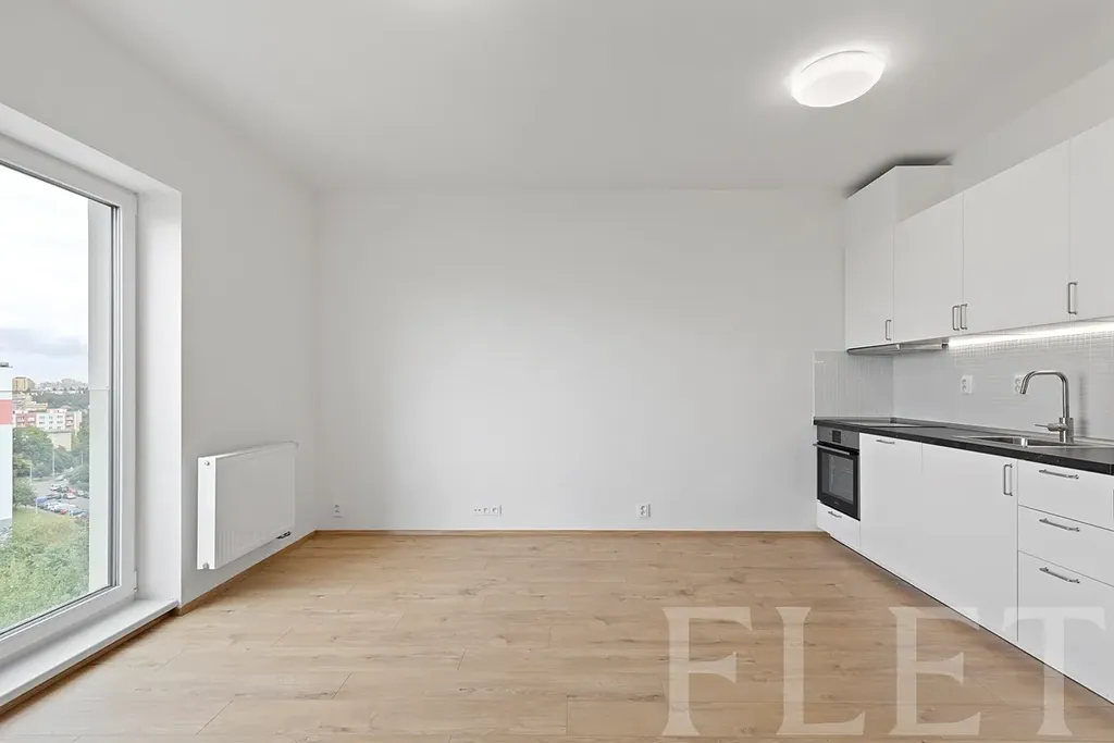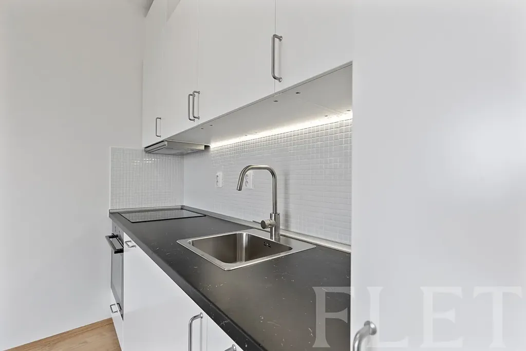 Kuchyně s obývací částí je díky velkému francouzskému oknu krásně prosvětlená, což prostoru dodává vzdušnost a příjemnou atmosféru po celý den. Moderní kuchyňská linka nabízí dostatek úložných prostor a poskytuje komfort pro každodenní vaření. V prostorné koupelně najdete sprchový kout, toaletu a pračku.