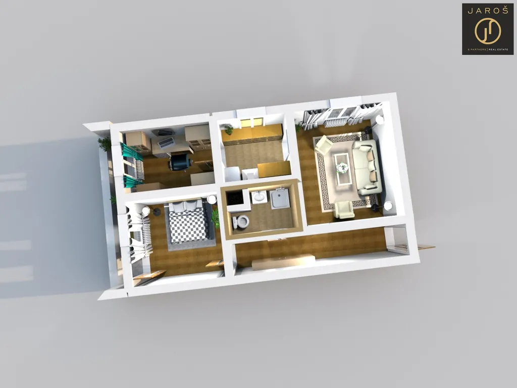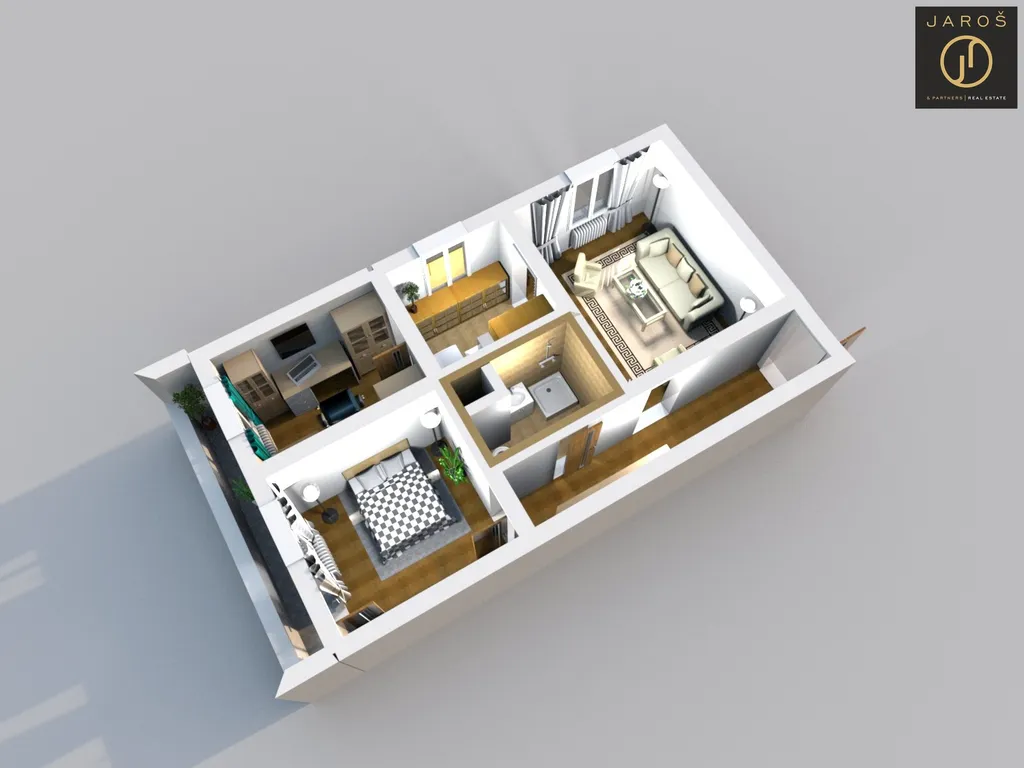 V současné době je byt rozdělen dispozičně na 3+kk ( původní dispozice 2+1), což může být vyhledávaná skutečnost, avšak pokud Vám nebude tato dispozice vyhovovat, lze ji lehce vrátit zpět.