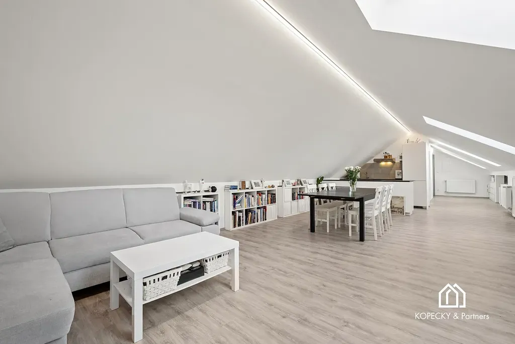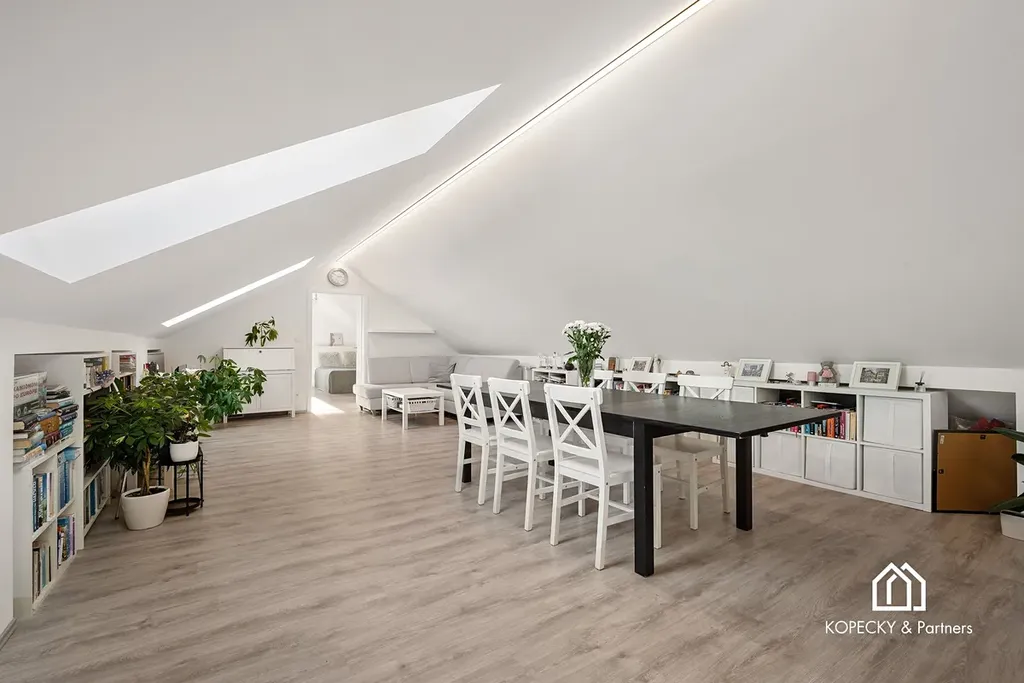 Hlavní obytný prostor působí světlým a příjemným dojmem, o což se starají nová střešní okna s trojskly, zajišťující kvalitní tepelnou i akustickou izolaci. Dispozice je řešena tak, aby nabídla dostatek komfortu i funkčnosti – od obývací části přes kuchyňskou zónu až po možnost vytvoření pracovního místa. Samostatná ložnice je situovaná tak, aby poskytovala soukromí a klid. Koupelna je moderní, čistá a prakticky řešená.