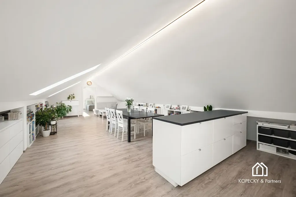 Byt nabízí 79 m² plně užitné plochy, což je pro dispozici 2+kk nadstandardní hodnota. Velkou výhodou jsou také podkrovní úložné prostory o velikosti přibližně 51 m², přístupné přímo z bytu. Celková podlahová plocha tedy činí 130 m², což majiteli poskytuje výrazně více flexibility než běžné byty této kategorie.