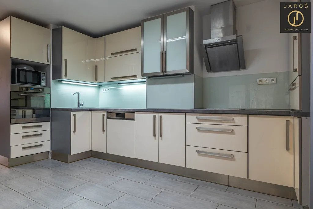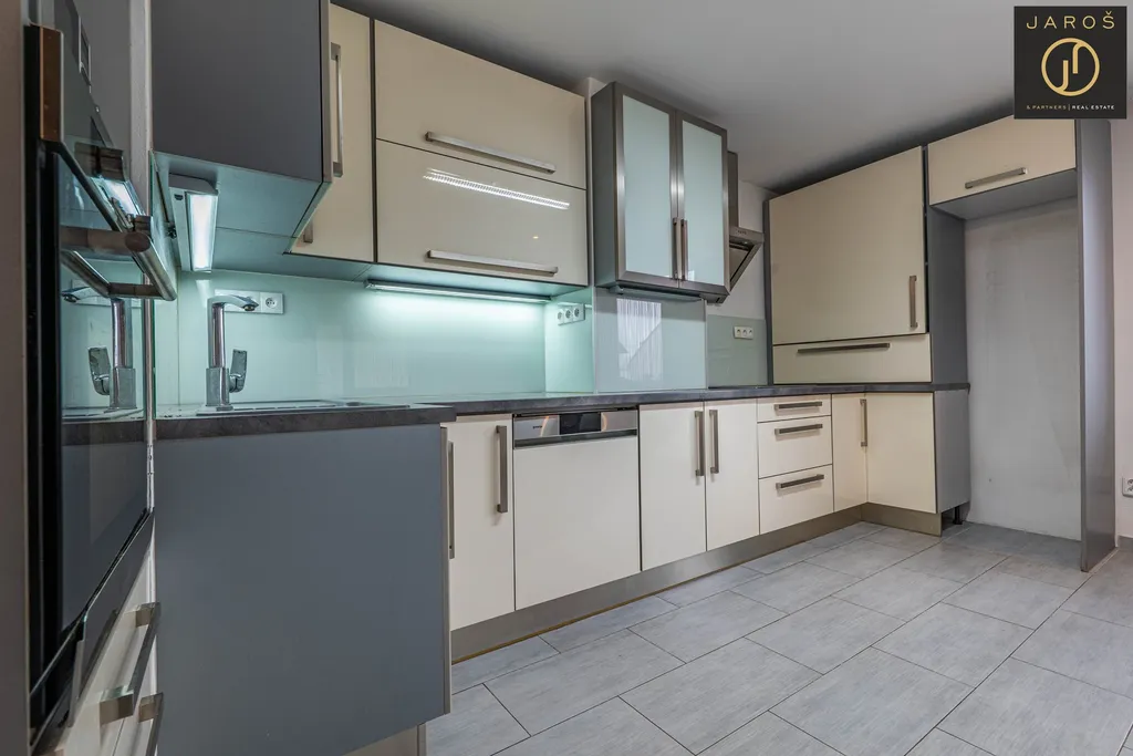 Interiér domu je navržen s ohledem na vzdušnost, praktičnost a pohodlí celé rodiny. Dominantou přízemí je velkorysý obývací pokoj propojený s moderní kuchyní, usazenou na míru, s vestavnými spotřebiči. Z obývací části je přímý vstup na rozsáhlou terasu, která nabízí ideální místo pro odpočinek nebo posezení s rodinou a přáteli.