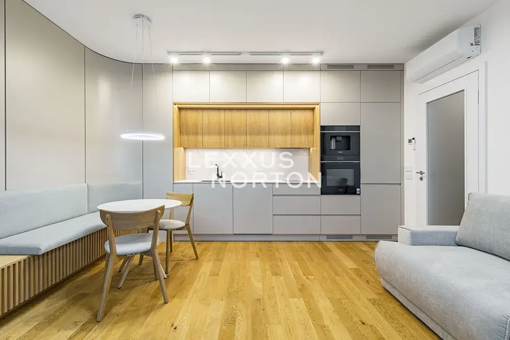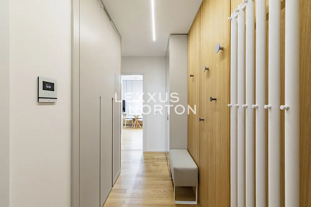 Byt se nabízí kompletně zařízený a připravený k okamžitému nastěhování. Kuchyňský kout je vybaven indukční varnou deskou, multifunkční troubou s mikrovlnnou funkcí, lednicí, mrazákem, myčkou nádobí a vestavěným kávovarem. Obývací část zahrnuje rozkládací pohovku, TV a jídelní stůl se židlemi. V chodbě jsou vestavěné skříně poskytující dostatek úložného prostoru. Ložnice nabízí postel s úložným prostorem, vestavěné skříně a TV. Koupelna je vybavena moderním walk-in sprchovým koutem a toaletou. K dalším výhodám patří klimatizace, pračka se sušičkou, venkovní elektrické žaluzie a místnost na mytí kol.